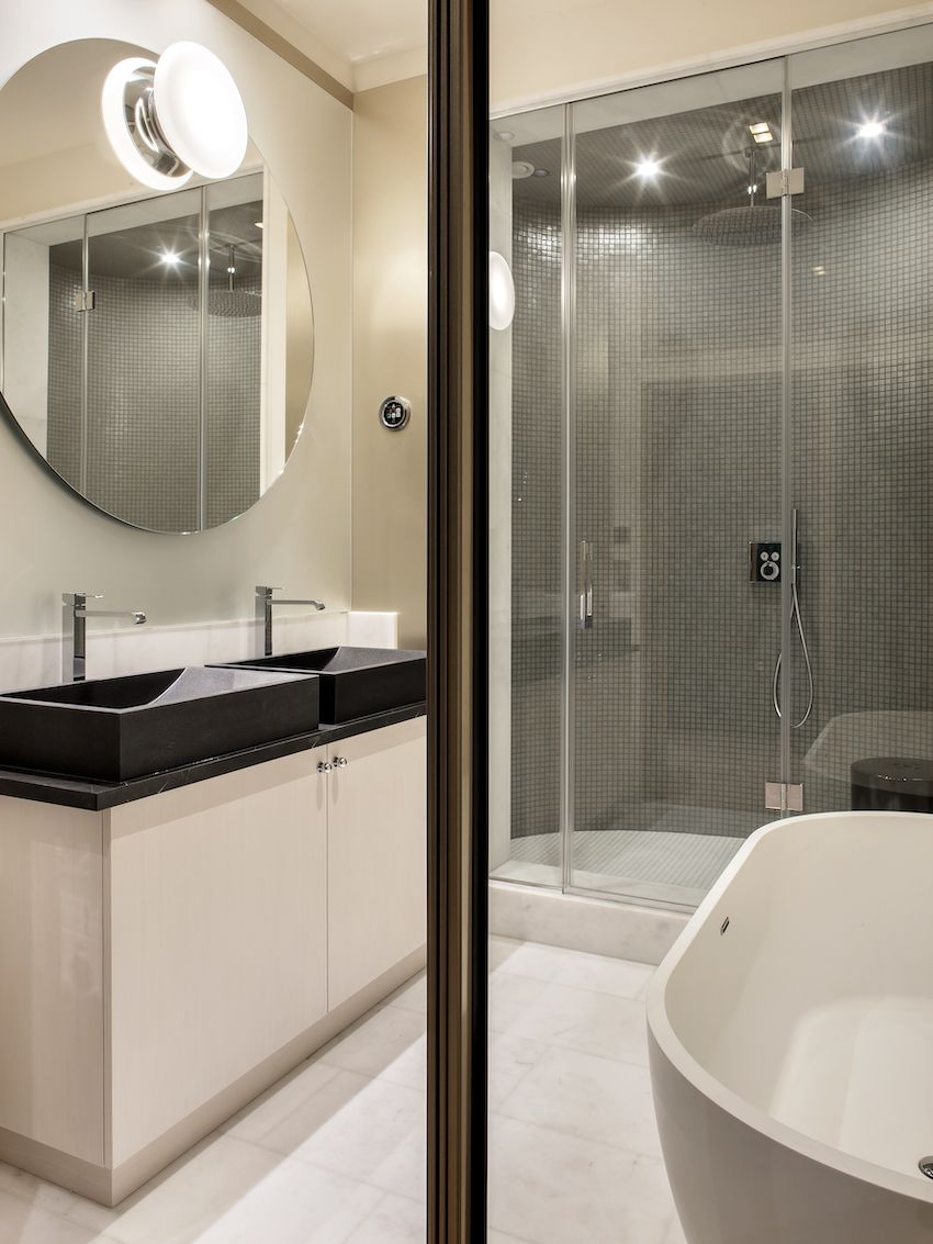 El baño principal cuenta con un tocador con dos lavabos debajo de un espejo redondo de gran tamaño frente a una gran bañera independiente. El área de la ducha está hecha con azulejos de mosaico de vidrio y complementa el resto del espacio con su piso de losas de mármol blanco.