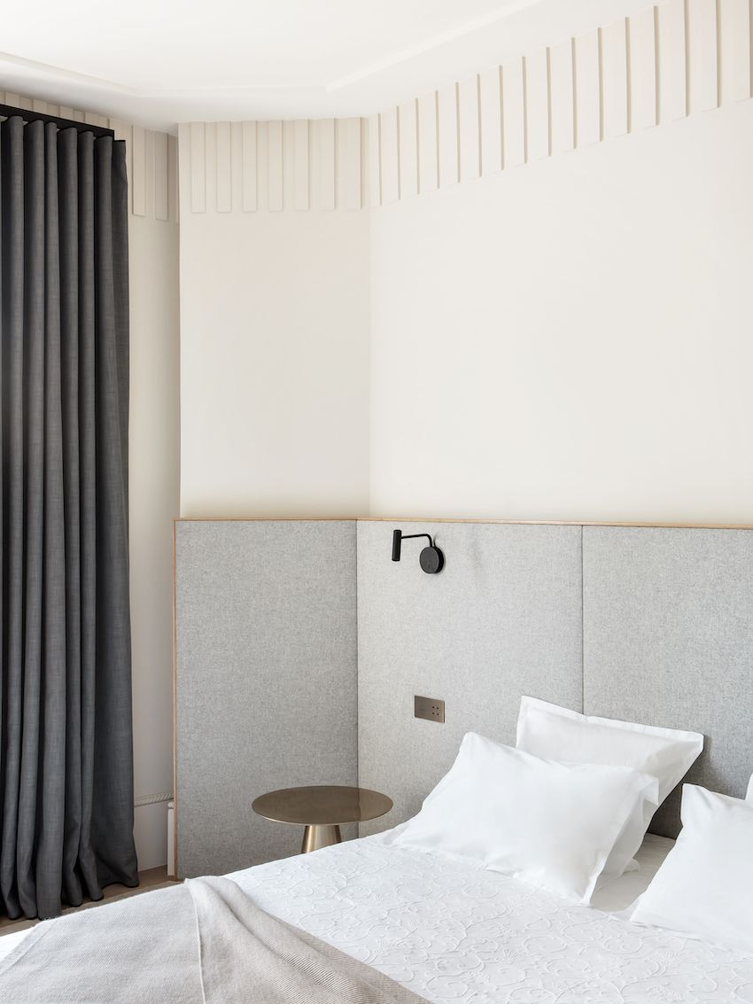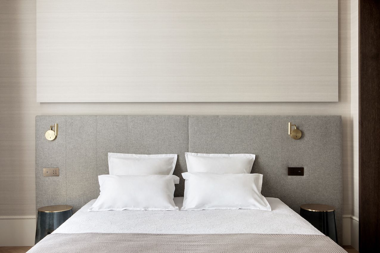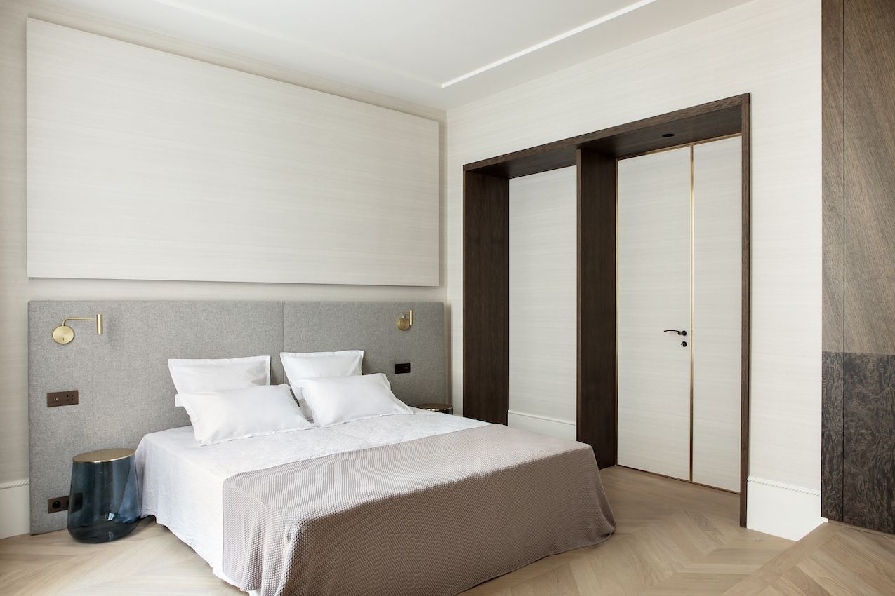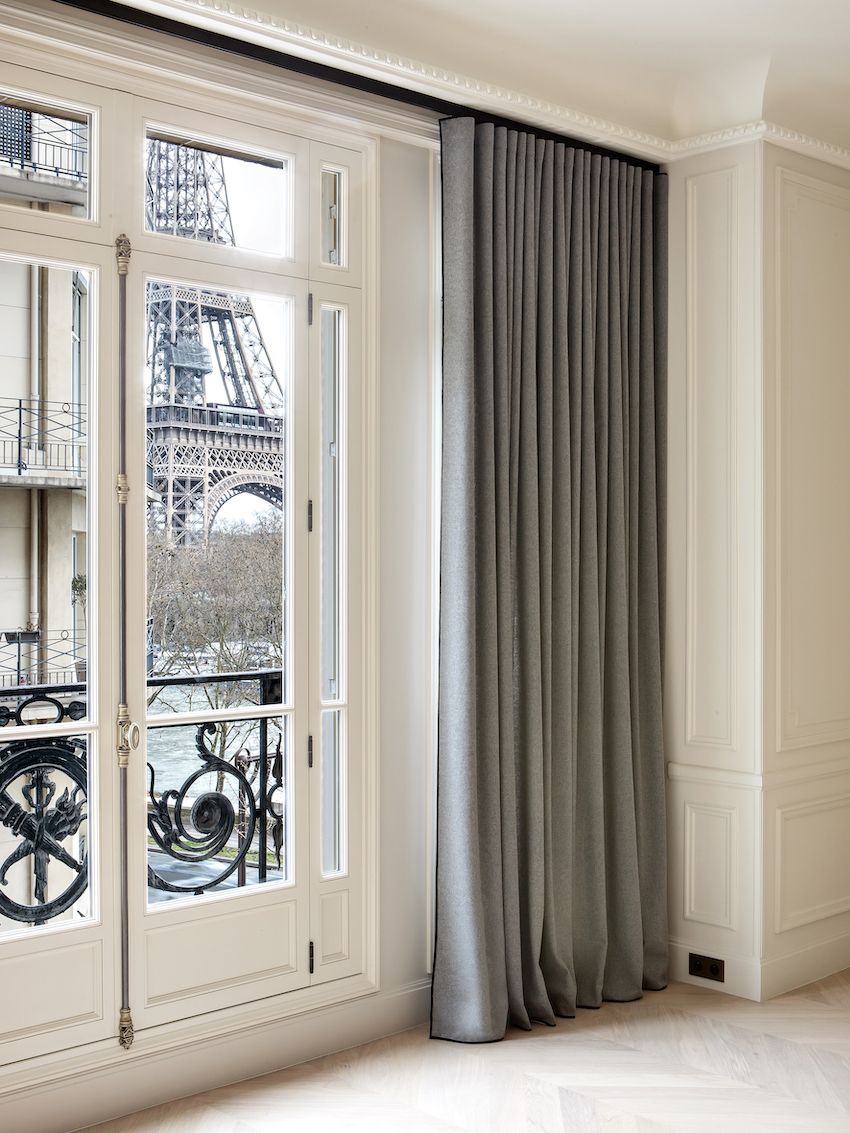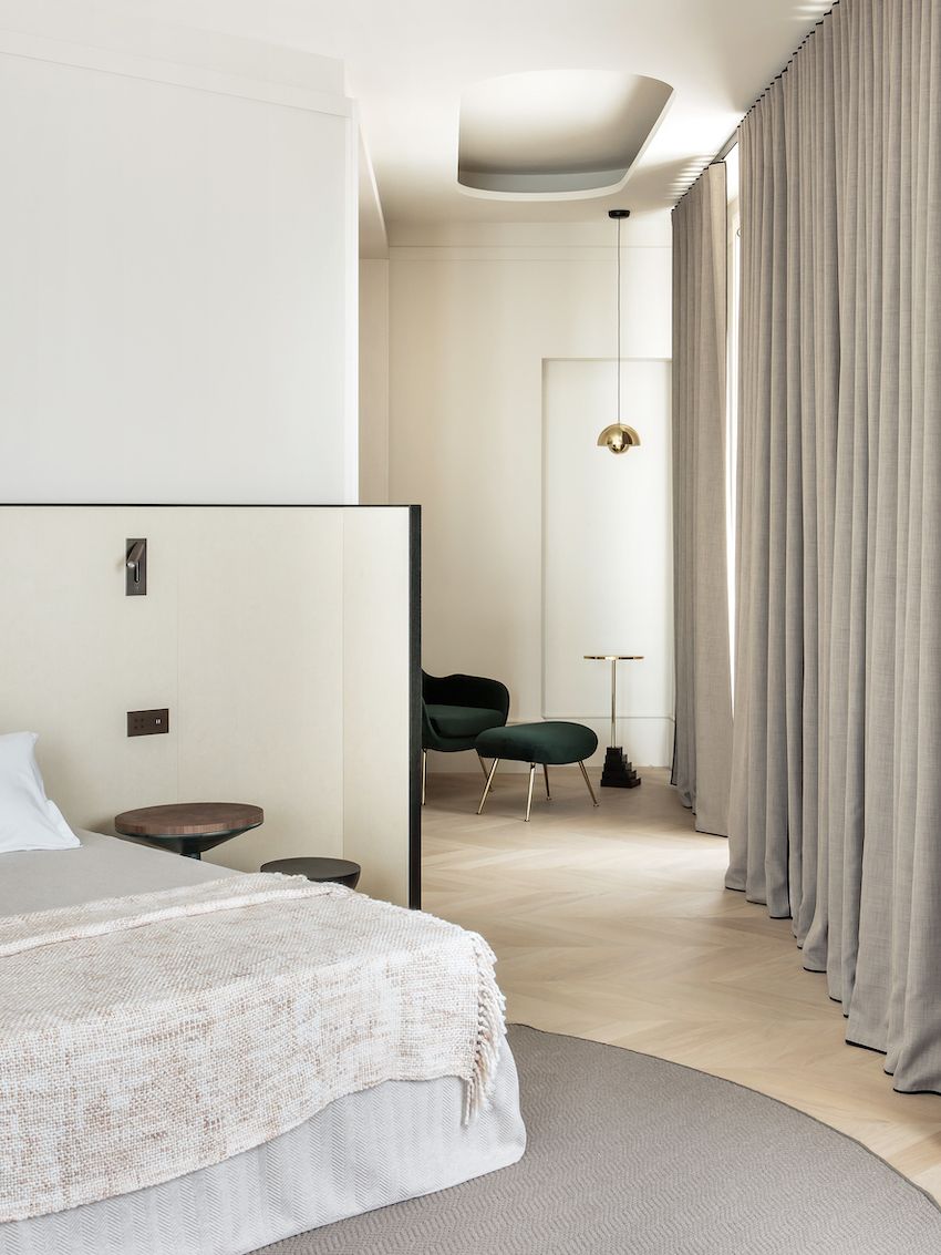 Todos los dormitorios tienen iluminación junto a la cama incorporada en las cabeceras personalizadas, lo que ayuda a mantener el espacio despejado y ordenado, un sello distintivo del estilo parisino. Las cortinas también son emblemáticas de este estilo de decoración con su longitud imponente, volúmenes generosos y tono neutro.
