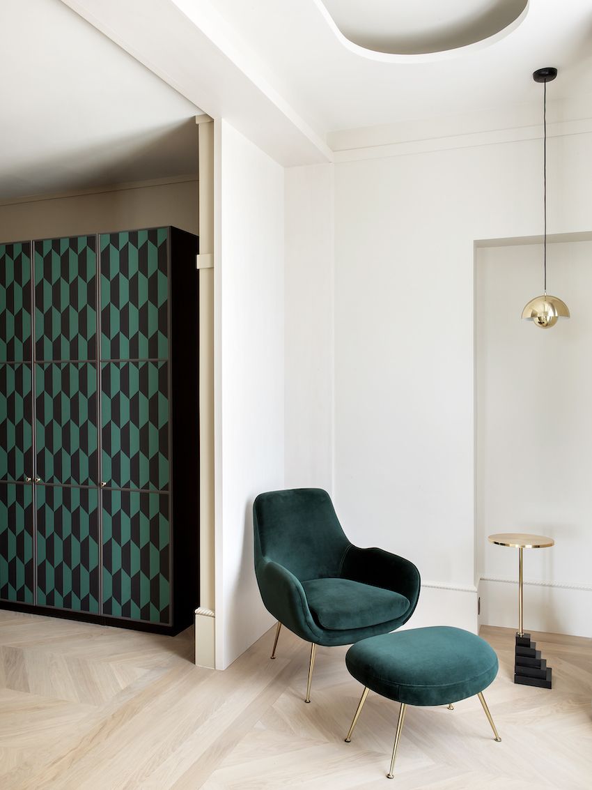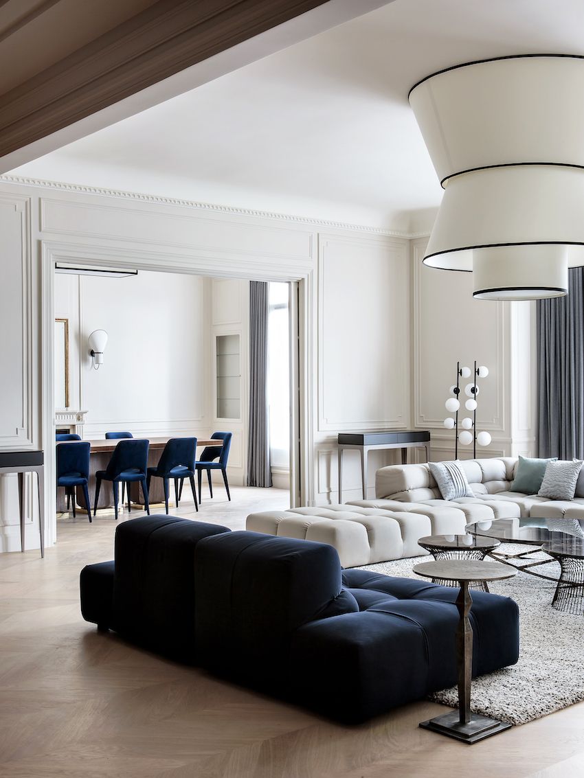 El apartamento fue diseñado por Rinck , una empresa conocida como el «embajador del arte de vivir francés» y la residencia ciertamente emana ese indescriptible estilo parisino en cada habitación. En funcionamiento durante casi dos siglos, Rinck tiene sus propios talleres de fabricación que crean artes decorativas, muebles y carpintería. Usando su gran experiencia, los diseñadores de la firma transformaron el espacio del tercer piso en una residencia contemporánea con influencias Art Deco en un período muy corto de 6 meses. El nuevo diseño reconcibió todo el apartamento, creando una residencia que se adapta a los estilos de vida actuales con habitaciones que tienen mejor fluidez y volumen.