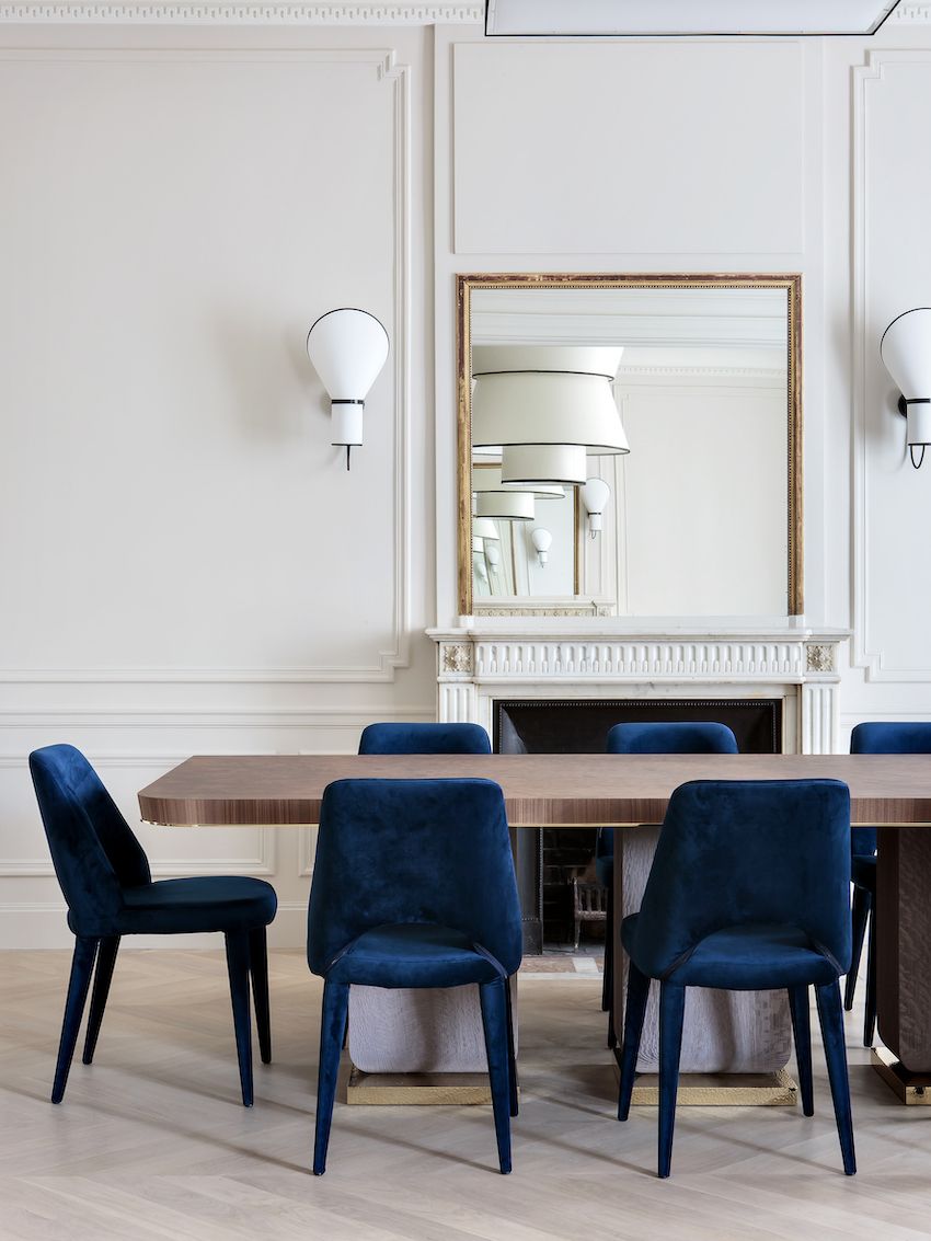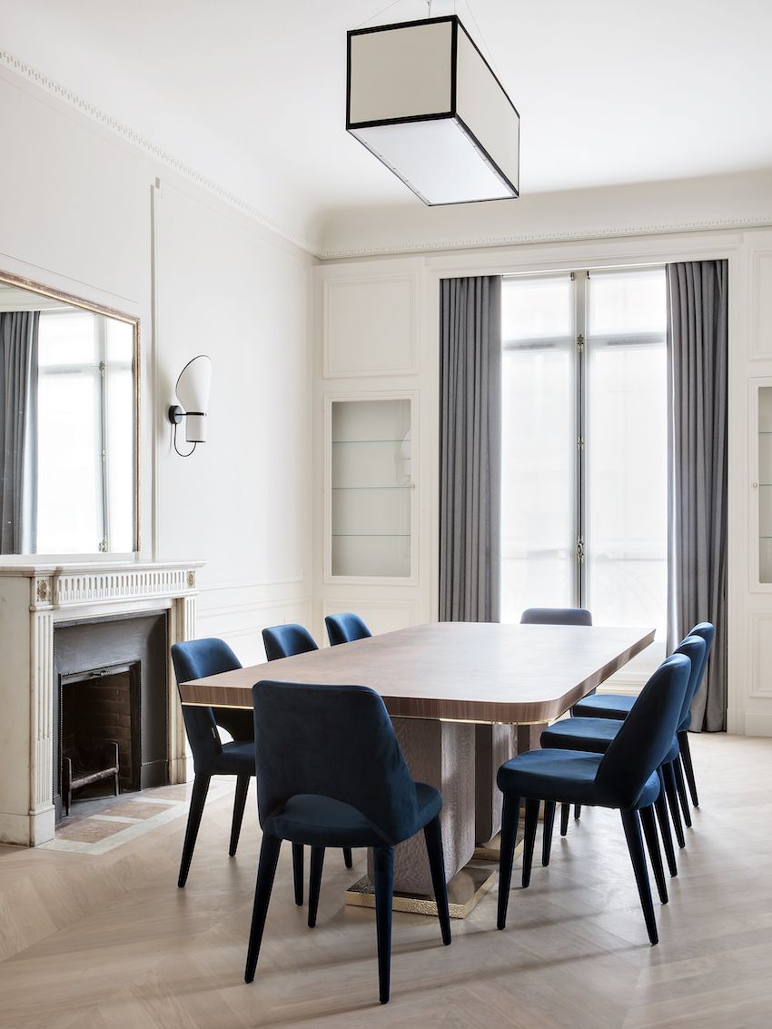 La generosa y elegante mesa de comedor fue diseñada y fabricada por Rinck y cuenta con una parte superior de nudo de nogal, un cinturón de latón pulido, patas de roble teñido de gris y una base de latón martillado . La paleta neutra general está acentuada por los ricos sillones de terciopelo azul cobalto que son muy cómodos y elegantes . La lámpara de suspensión sobre la mesa también está realizada en percal de algodón. Los acentos negros de la luz hacen eco de los de las luces de la sala de estar. La chimenea del comedor está en perfecta simetría con la segunda chimenea del salón, también original del espacio.