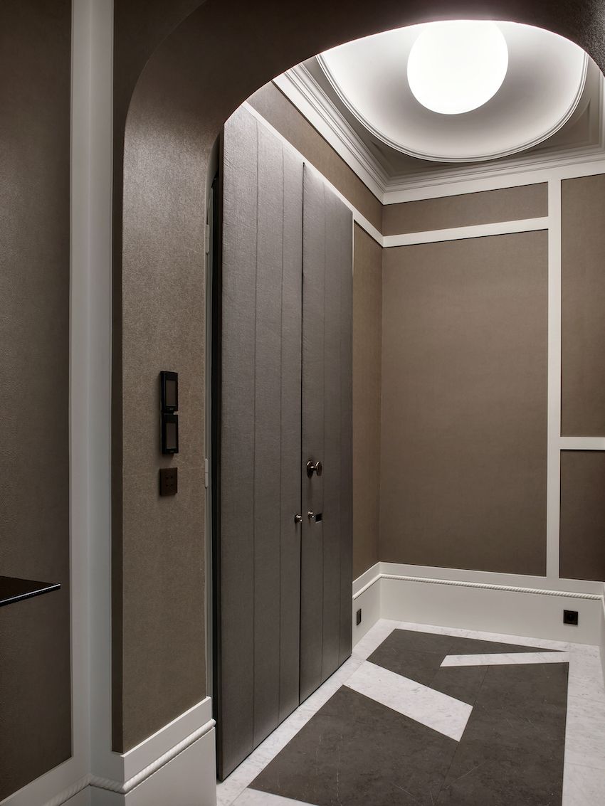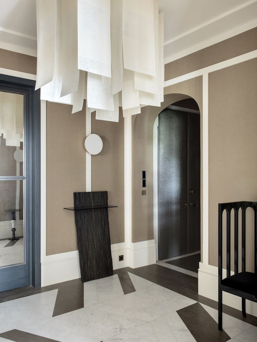 Una entrada principal presenta paredes hechas en tonos de topo cálido combinados con un blanco cremoso para magnificar la altura de las áreas. Hay piezas de galerías: la consola Habile de Frédéric Saulou y el sillón Arch Narrow de Dimitry Samygin de la Galería Savannah Bay, así como un colgante Alexandra decididamente decorativo de Enrico Franzolini . El piso es de mármol de Cascais, Portugal, en un patrón de parquet.