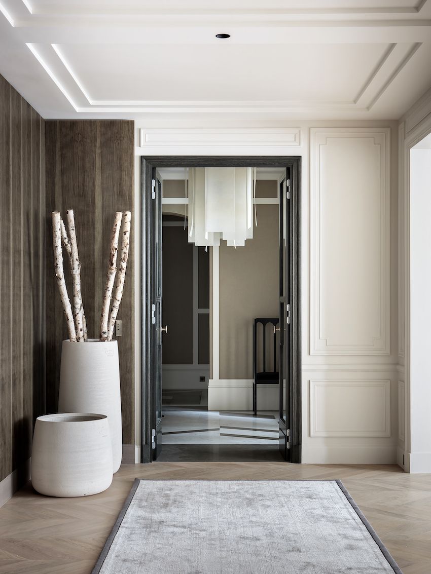 En todo el apartamento, los detalles exquisitos, como las molduras, los paneles de las paredes, las ventanas y las puertas, causan un gran impacto de una manera muy sutil y elegante. Los elementos pequeños y mucho interesan a un espacio neutral y permiten que el foco esté en otros elementos más importantes. La forma en que las largas cortinas enmarcan las ventanas y las exquisitas vistas son ideales.