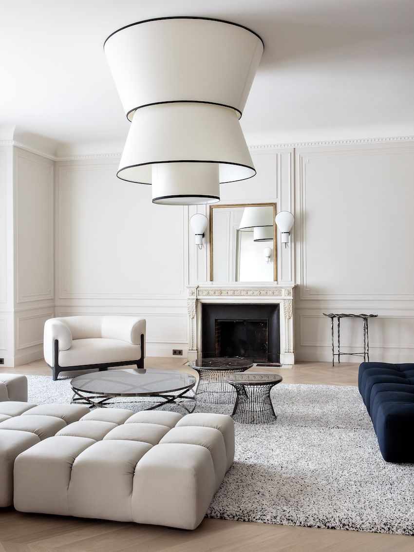 El gran salón está delimitado por dos grandes puertas correderas de época que la firma de interiorismo restauró. El espacio principal está lleno de luz y es relajante, está amueblado con asientos bajos que se enfocan en el candelabro de suspensión súper grande y dramático que está hecho de percal de algodón diseñado por Rinck y hecho a mano por un artesano en el sur de Francia. La colección central de mesas bajas también complementa la iluminación. La sala de estar se amplió integrando gran parte de la entrada original en el espacio habitable.