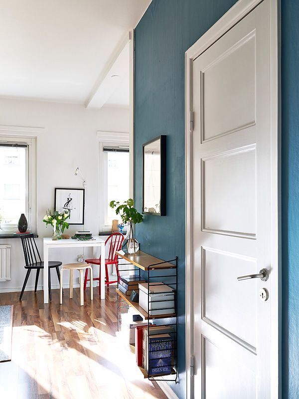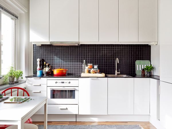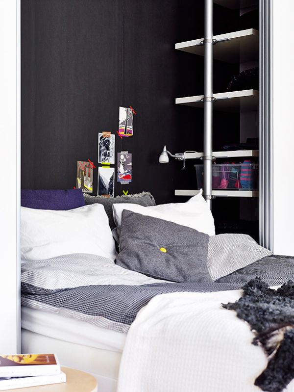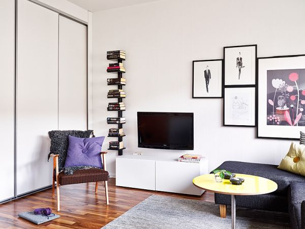 Además, la paleta de colores es muy importante en este caso. Este estudio presenta una paleta cromática basada en tonos neutros como el blanco, el gris y el negro. Las paredes son blancas y crean la ilusión de un espacio más grande. Sin embargo, cada habitación tiene un toque de color. En el caso del dormitorio, por ejemplo, observe ese pequeño punto amarillo en la almohada o esa almohada decorativa morada. Son pequeños acentos, pero son exactamente lo que la decoración necesita para ser elegante. {Encontrado en Stadshem }.