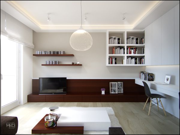 Como no había suficiente espacio para una sala de estudio separada, esta área se incorporó a la sala de estar. Cuenta con armarios de almacenamiento y mucho espacio para suministros. El escritorio largo es perfecto ya que permite que tanto la madre como la hija lo usen al mismo tiempo, ya sea haciendo cosas diferentes o trabajando en la tarea. Se adoptó un diseño similar para el resto del loft. En general, el diseño interior es muy simple y la atención se centra en la funcionalidad.