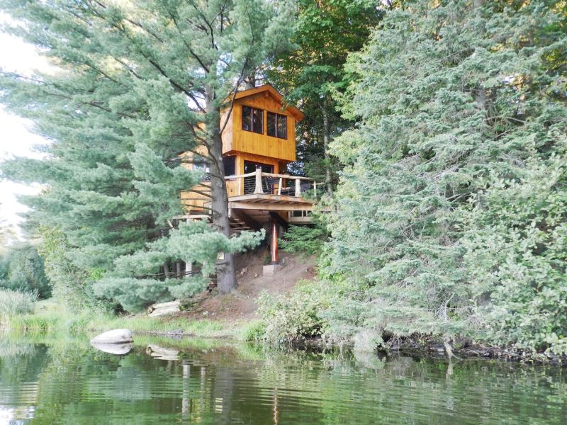 Por ejemplo, esta casa del árbol de 1 dormitorio está ubicada en el borde de Walker Pond en Vermont. Está construido en los árboles, suspendido entre dos pinos y presenta una escalera de caracol que serpentea alrededor de los árboles y sube hacia la terraza en la parte delantera de esta pequeña cabaña. {encontrado en airbnb }