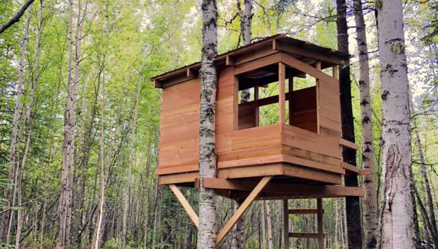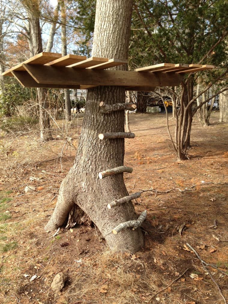 Este diseño utiliza ambos lados del árbol y nos atrae especialmente su divertido letrero de «cuidado». Si visita Instructables , se le guiará a través del proceso de creación en dieciséis pasos. Esos pasos incluyen: montar los soportes principales, diseñar la plataforma, unir esos soportes y más.