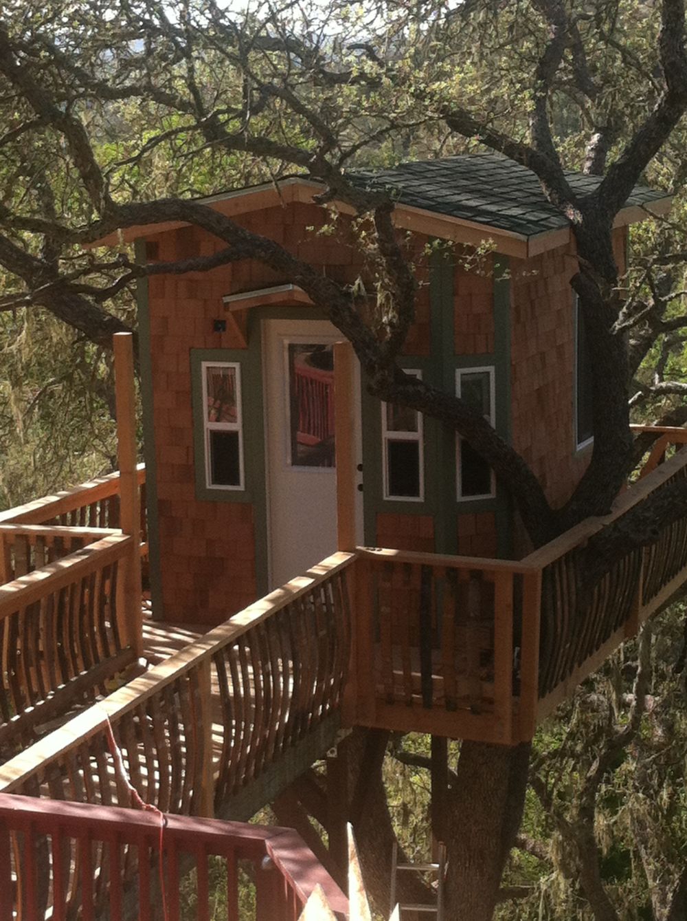 Aquí hay otra casa en el árbol de «lujo» para inspirarse. Completo con un balcón para caminar, ventanas, puertas y contraventanas de colores, si realmente quiere consentir a la familia, esta también es una manera de hacerlo.