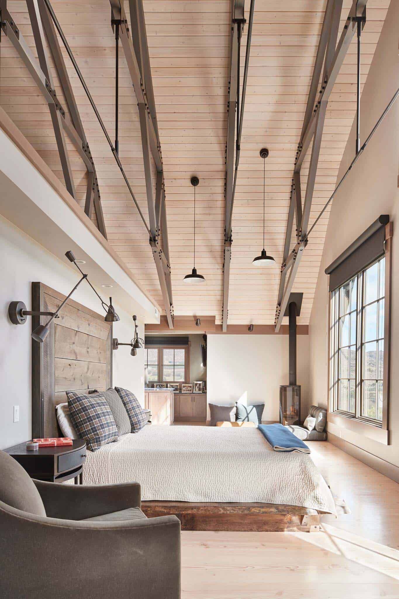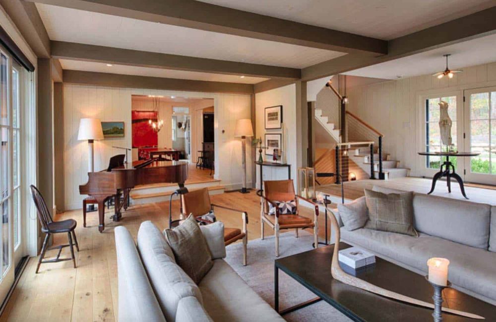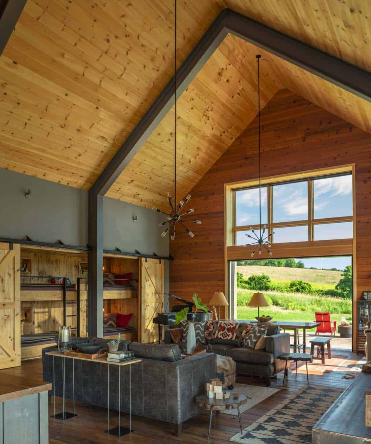 Como puede suponer, la configuración exterior de esta casa y su paleta de colores coinciden. Los espacios interiores son luminosos, abiertos y aireados, lo que los hace bastante diferentes de los típicos espacios de graneros rústicos.