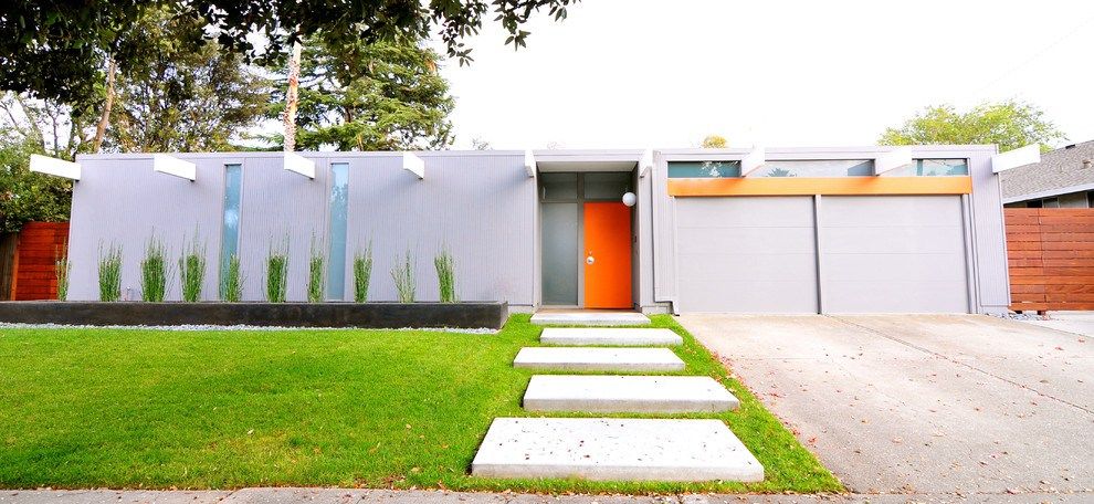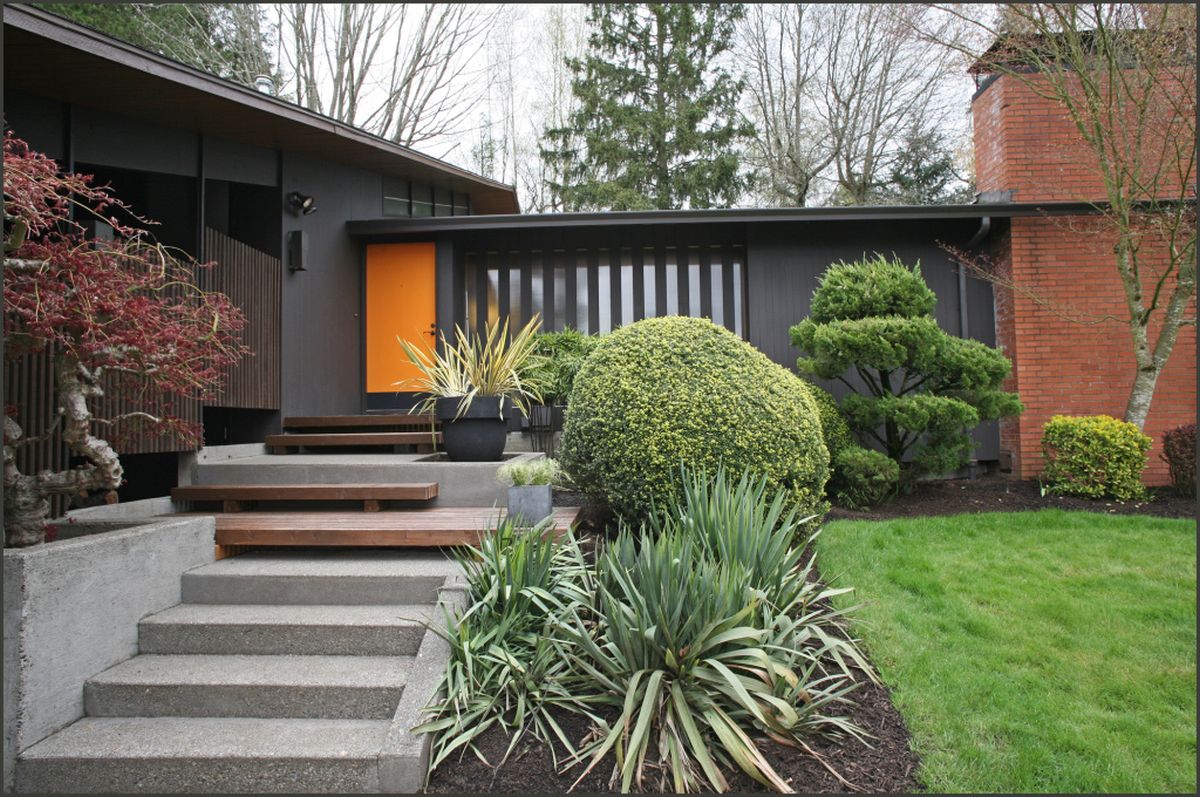 Las casas modernas de mediados de siglo están hechas para llamar la atención. Por lo general, habrá un color brillante en algún lugar del exterior. Por lo tanto, elegir un color gris neutro para el exterior de la casa ayudará a dirigir los ojos hacia donde quiere que vayan, como la brillante puerta de entrada.