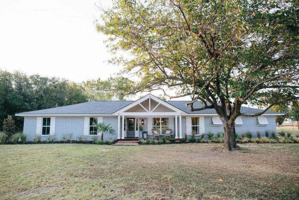 El gris es un color encantador para el exterior de la casa, especialmente cuando se pinta sobre madera o ladrillo para que la textura se destaque. Dado que la mayoría de las casas estilo rancho tienen uno u otro, el gris es la solución exterior perfecta.
