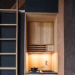 El exterior de la sauna tiene un revestimiento de madera. Los diseñadores utilizaron una antigua técnica japonesa llamada Yakisugi y quemaron la madera exterior para iniciar la oxidación y hacerla más resistente a la intemperie y los parásitos. Al final, esta técnica también permite que la cabina se mezcle con el área circundante para preservar el espacio sereno y tranquilo.