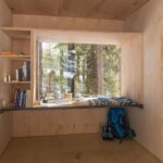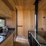 Los constructores organizaron el interior en tres áreas diferentes. El espacio incluye una zona de cocina y sala de estar, un baño y un dormitorio doble. Los arquitectos utilizaron materiales sostenibles y no tóxicos en todo el diseño interior. El principal material utilizado en toda la cabaña es la madera que proviene de bosques regulados.