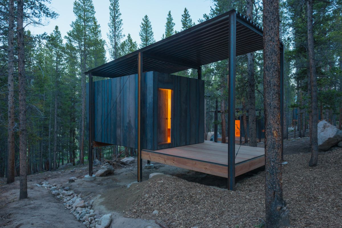 Los arquitectos diseñaron estas pequeñas casas en este sitio para la Escuela Outward Bound de Colorado como microdormitorios. Construyeron cada unidad para abrazar el paisaje de una manera única, ya que están dirigidas hacia el bosque en lugar de entre sí. Todas las cabañas tienen un porche delantero, pero el espacio negativo entre las cabañas es un área para la comunidad.