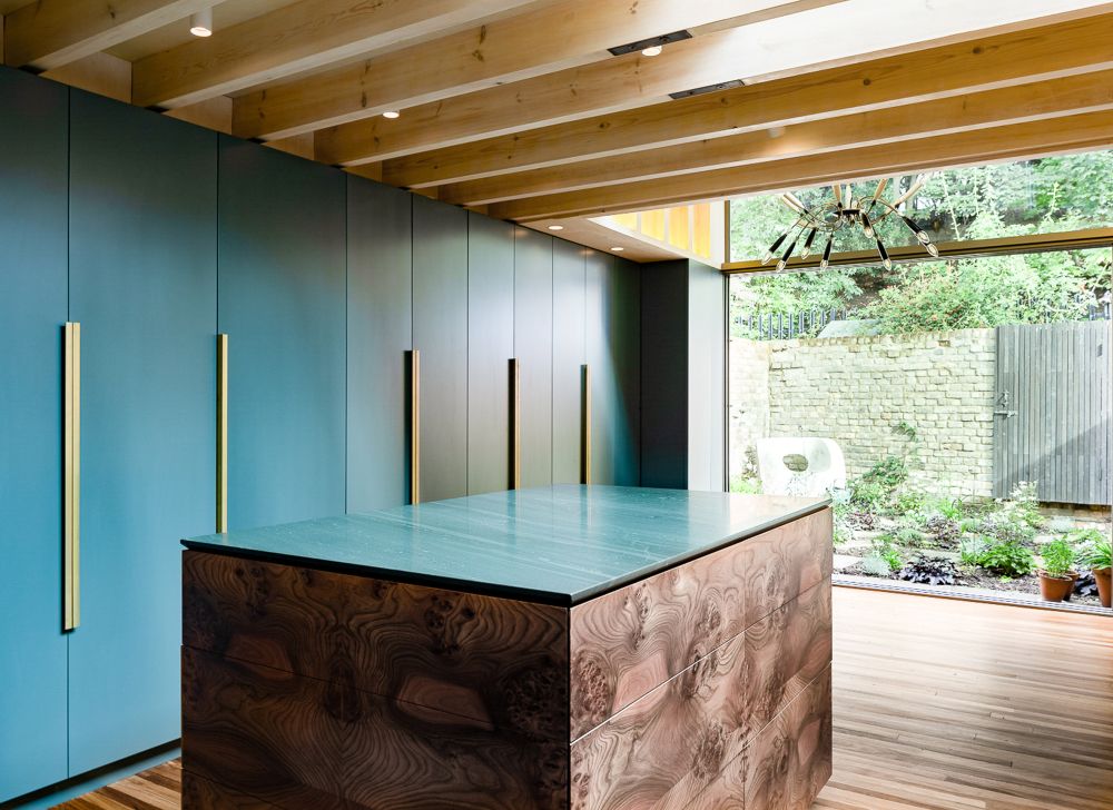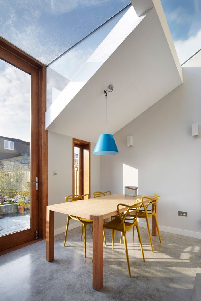 Esta puerta pivotante de gran tamaño es en realidad más alta que el techo inclinado de la nueva extensión y sobresale introduciendo una serie de tragaluces y ventanas en las esquinas. El papel principal de esta extensión fue agregar un nuevo espacio de comedor a la pequeña área de la planta baja de la casa. De hecho, terminó teniendo un mayor impacto en la casa principal de lo planeado, ya que también se eliminaron las divisiones existentes entre la sala de estar y la cocina para crear un plano de planta más grande y más abierto. La gran puerta de vidrio que mencionamos anteriormente ayuda a conectar la casa con el jardín y trae mucha luz natural a estas áreas.