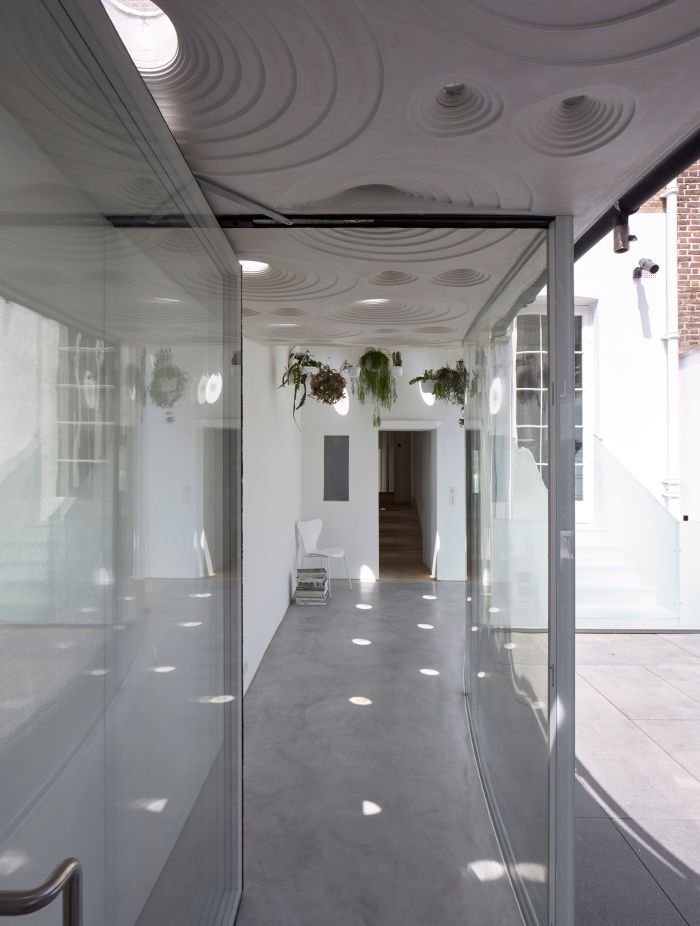La nueva extensión se agregó a la parte trasera de la casa existente y su función era agregar más espacio habitable y un área de trabajo a la casa principal. También hace uso del área del jardín exterior de la propiedad que anteriormente no se usaba mucho. Los propietarios optaron por una estética contemporánea para esta nueva sección, que contrasta mucho con la fachada del antiguo edificio. Le dieron este techo realmente genial hecho de madera contrachapada en capas que se curva y se extiende por toda la longitud del jardín. Tiene una forma cóncava y hay una gran abertura en ella que permite que la luz del sol entre en las habitaciones de abajo durante todo el día.