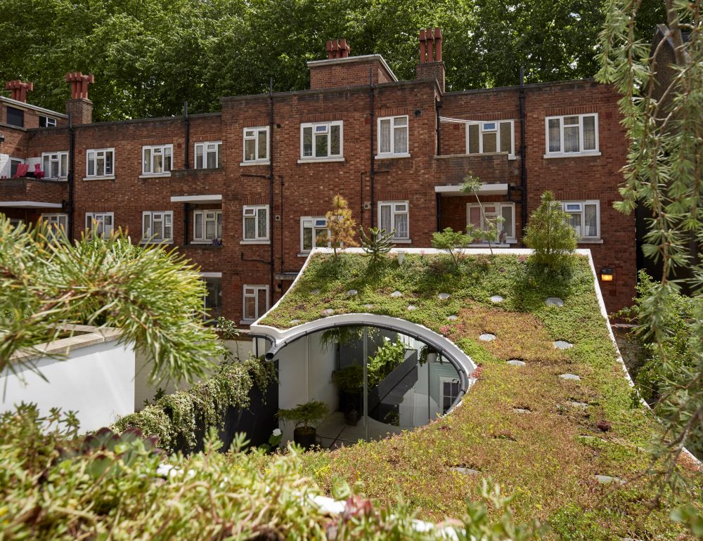 A veces, las ampliaciones de la casa están diseñadas para combinarse con el diseño original tanto como sea posible para que la transición de lo antiguo a lo nuevo sea perfecta. Aquí, sin embargo, la estrategia fue bastante diferente. Esta ampliación fue añadida por el estudio Tonkin Liu a una casa adosada de Londres y no se parece en nada al edificio original. Por un lado, tiene un techo verde y una forma cóncava realmente inusual.