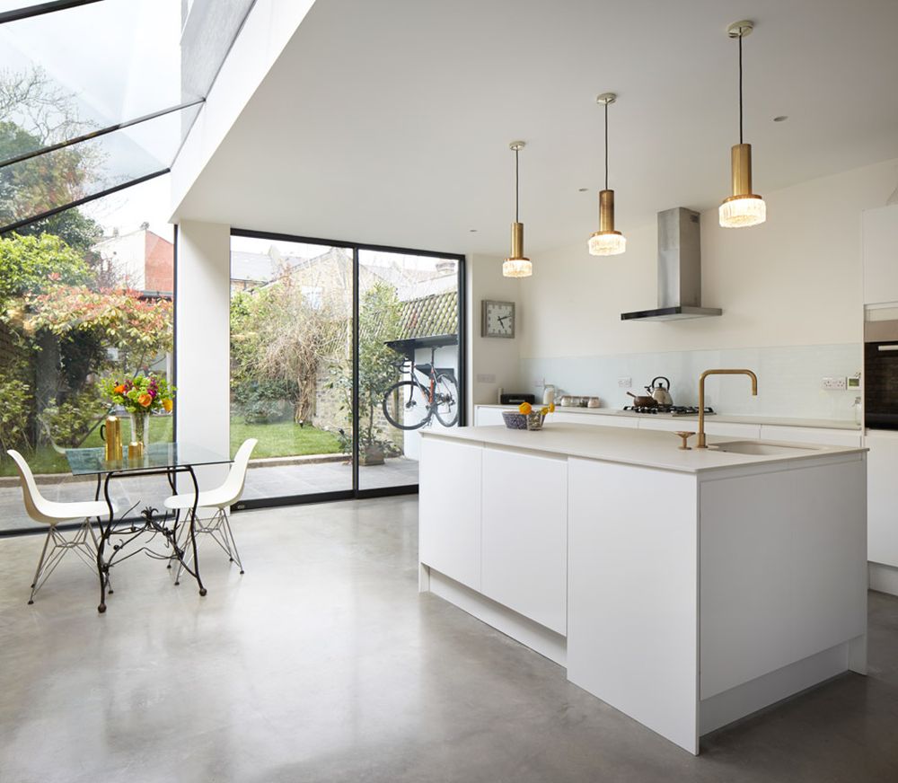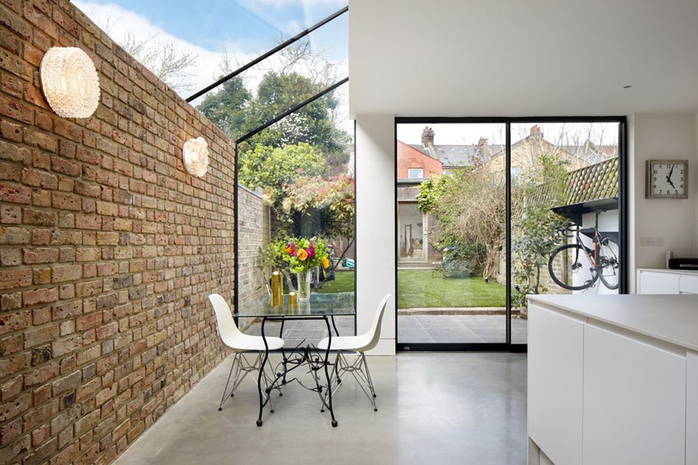 La estética contemporánea y minimalista de la nueva ampliación contrasta con las paredes de ladrillo visto de la casa existente, pero los dos estilos logran coexistir en armonía y complementarse entre sí. Las paredes y el techo blancos planos resaltan las paredes de ladrillo texturizado y le dan más énfasis. La extensión contiene la nueva cocina y el comedor de la casa y su diseño acristalado también permite que la luz penetre más profundamente en la casa, transformando toda la planta baja.