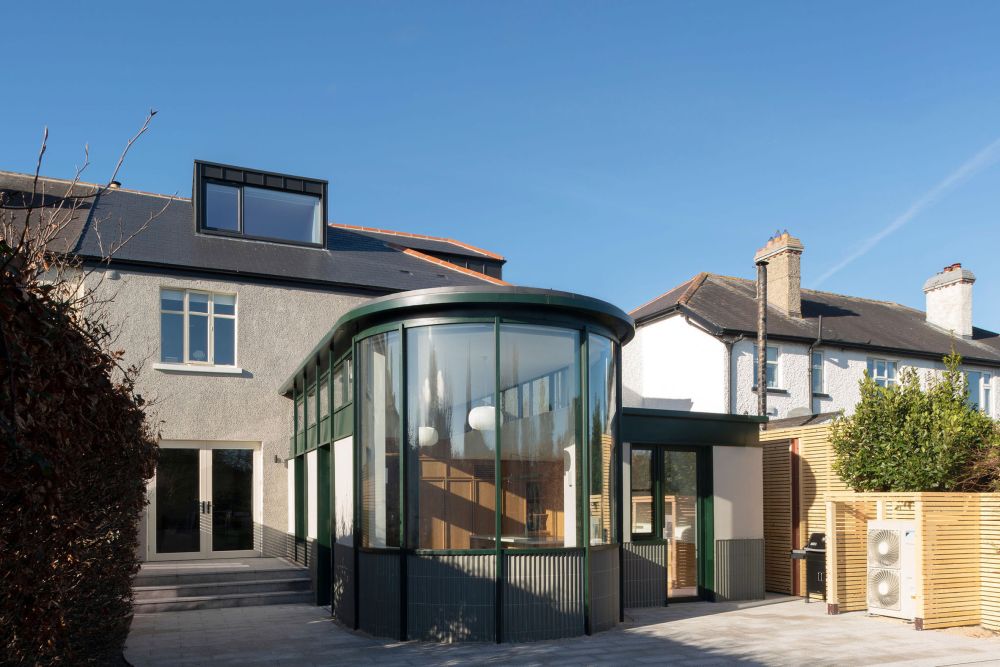 La casa original que ves aquí fue construida en la década de 1930 y ha sido una hermosa casa desde entonces. Recientemente, sus propietarios decidieron agregar una extensión para crear un plano de planta más orientado a la familia. Trabajaron con el estudio Scullion Architects para que esto sucediera. Los arquitectos idearon un diseño que agrega una sección curva de vidrio a la casa, una estructura que recuerda a los conservatorios victorianos pero con una estética más moderna y simplificada.