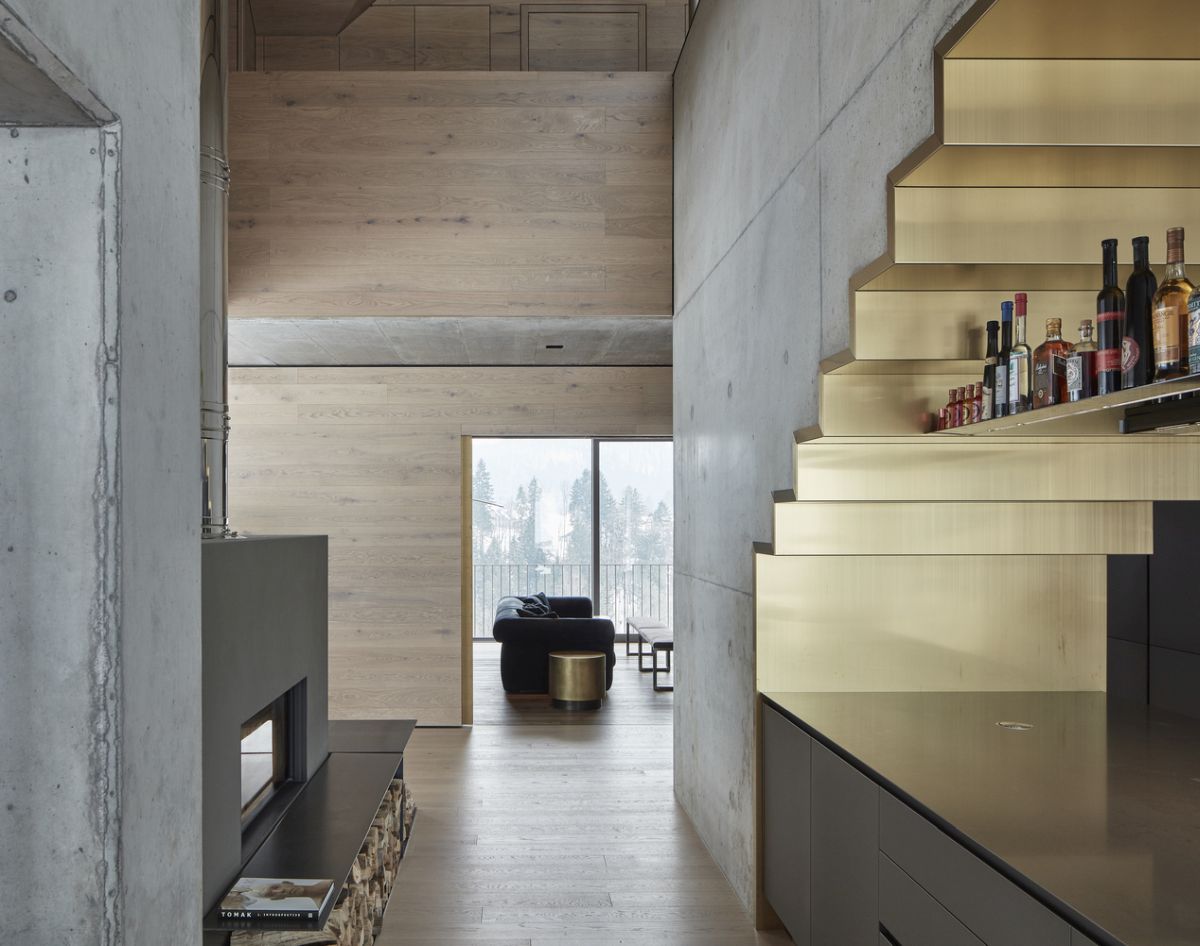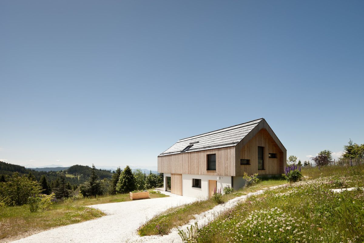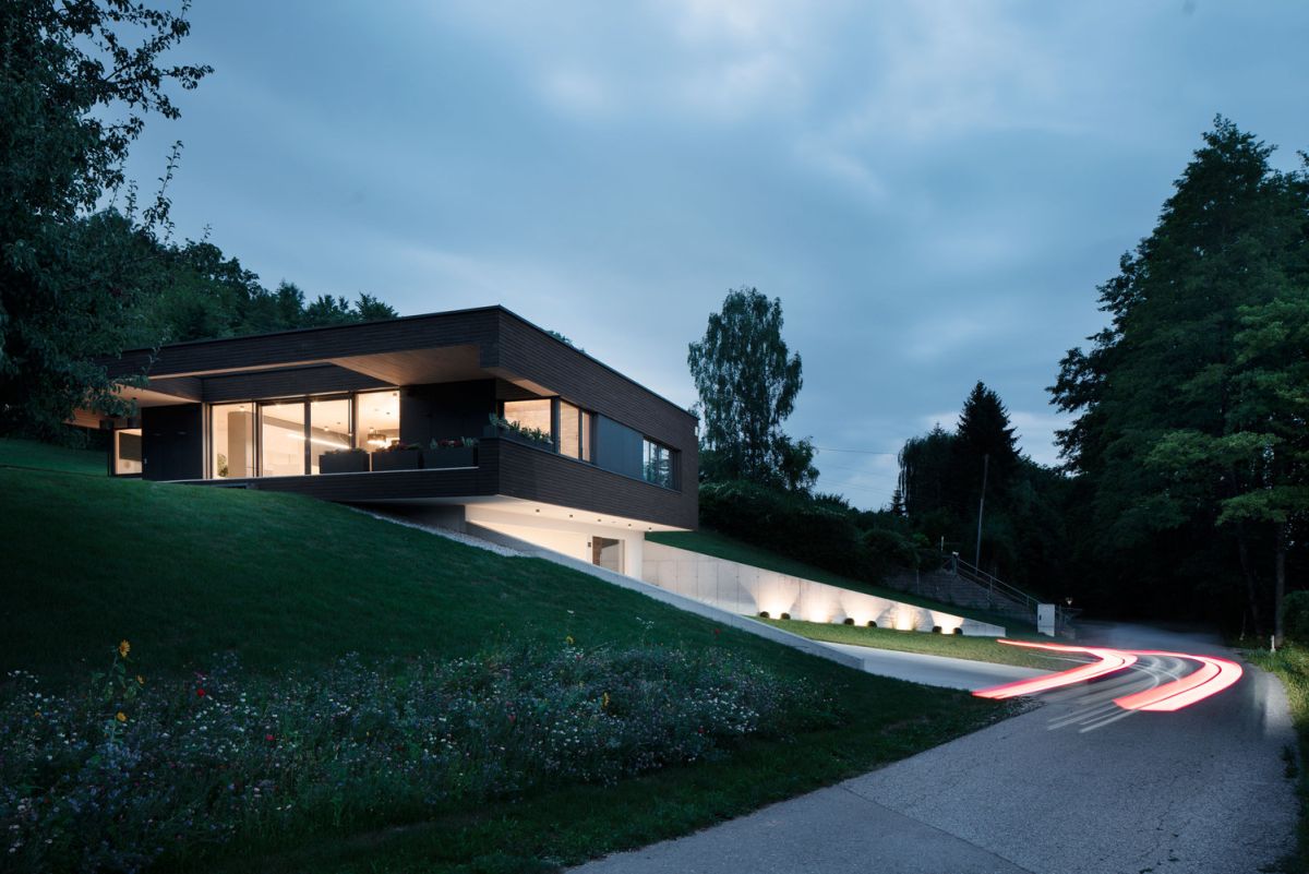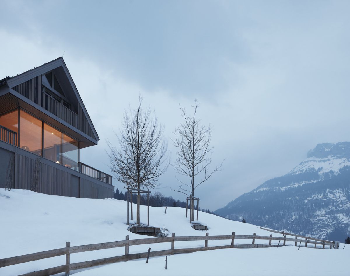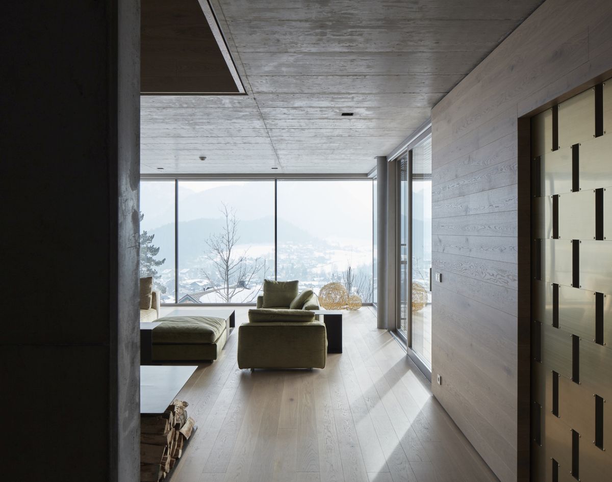 Como muchas otras casas modernas, esta se construyó con una combinación de materiales simples como madera , hormigón y vidrio. Es una combinación que funciona a su favor, lo que le permite aprovechar las magníficas vistas, mezclarse con la lengua vernácula y también verse y sentirse muy atractivo y acogedor. La casa fue diseñada por el estudio mia2/Architektur y se encuentra en un terreno inclinado con vista a los Alpes. La planta baja está parcialmente empotrada en la ladera, estando medio metro por debajo del nivel del terreno en un punto.