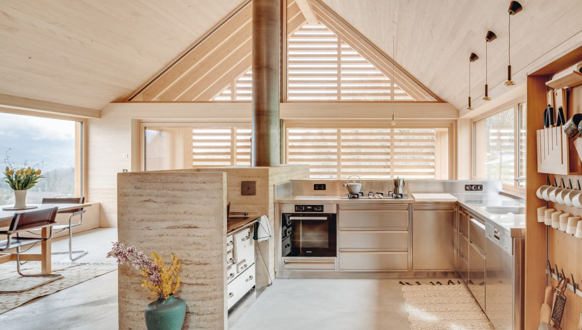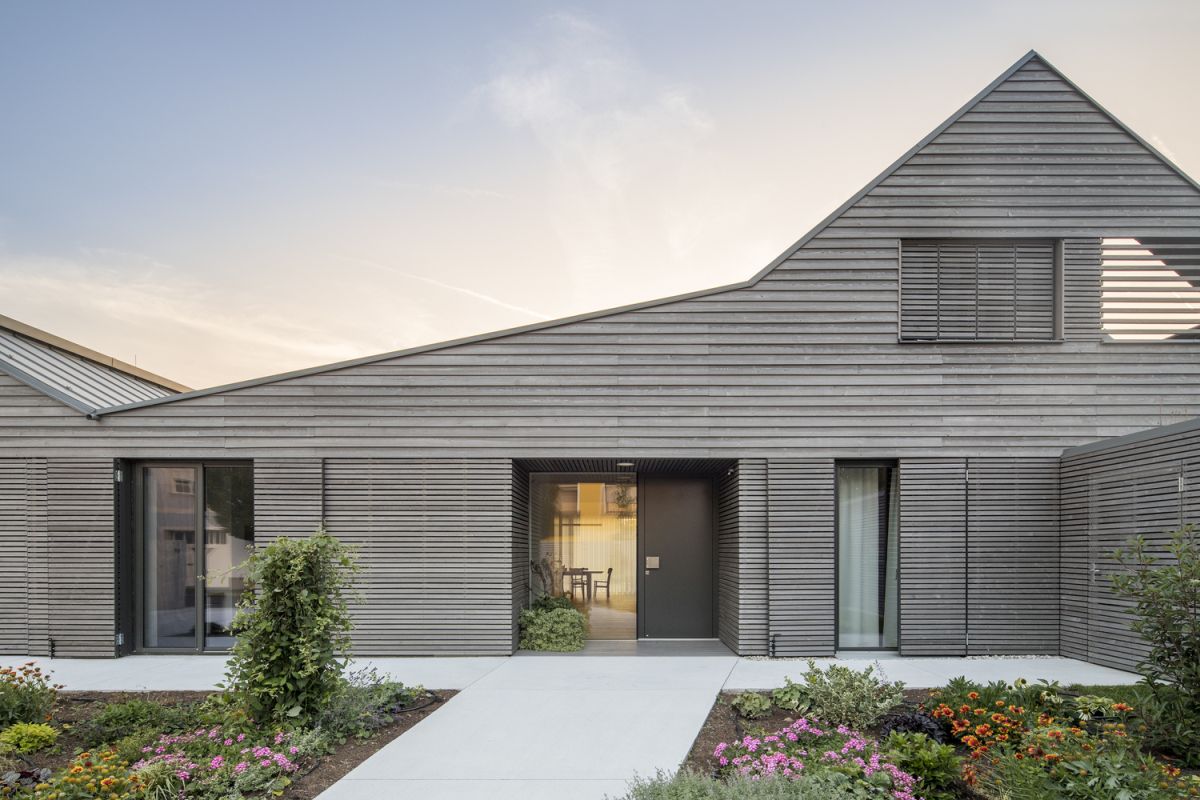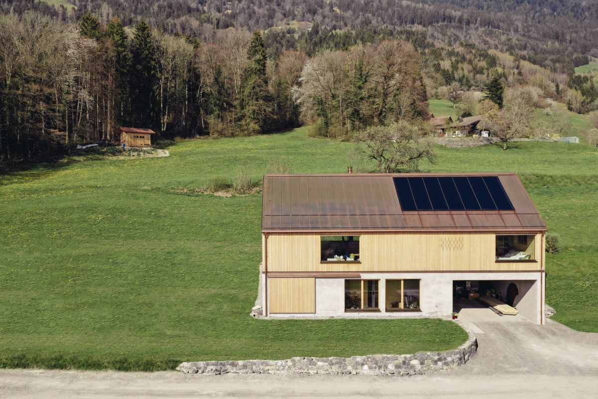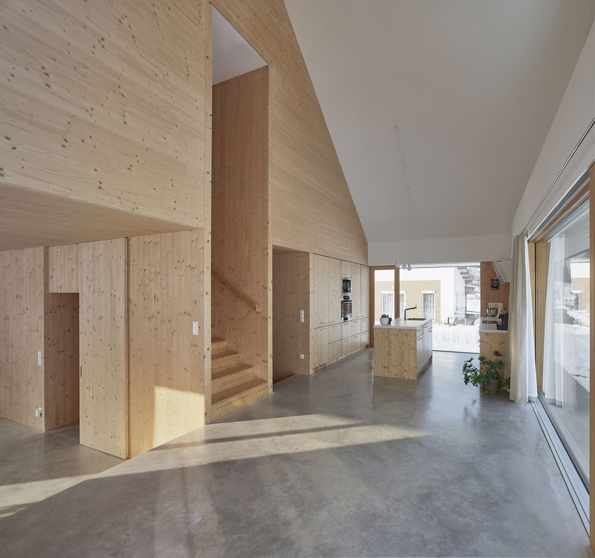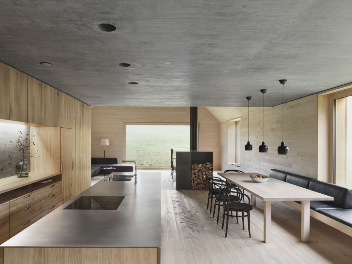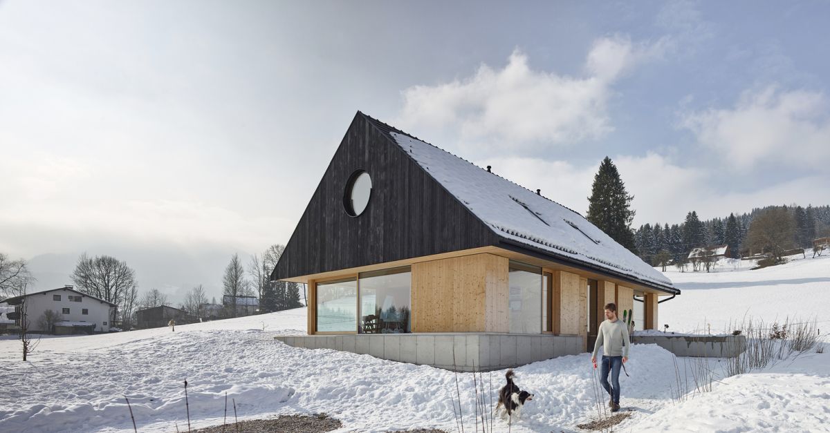 Como muchas otras casas modernas, esta se construyó con una combinación de materiales simples como madera , hormigón y vidrio. Es una combinación que funciona a su favor, lo que le permite aprovechar las magníficas vistas, mezclarse con la lengua vernácula y también verse y sentirse muy atractivo y acogedor. La casa fue diseñada por el estudio mia2/Architektur y se encuentra en un terreno inclinado con vista a los Alpes. La planta baja está parcialmente empotrada en la ladera, estando medio metro por debajo del nivel del terreno en un punto.