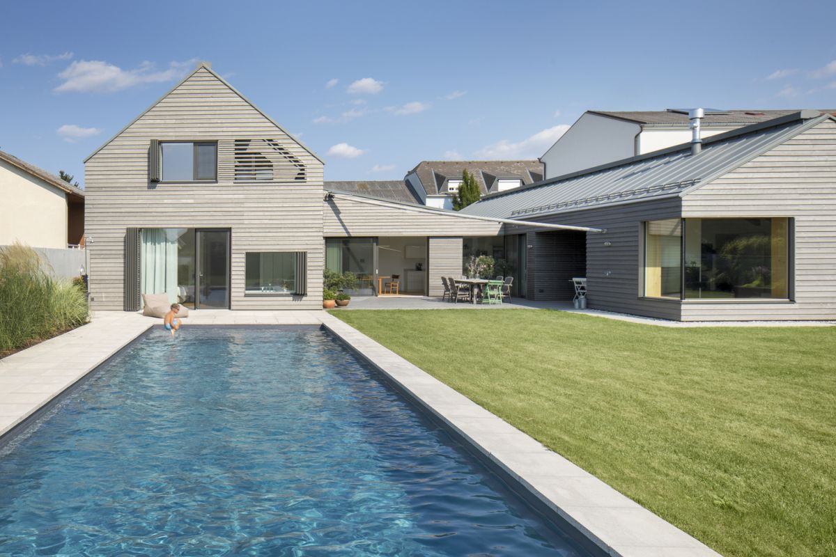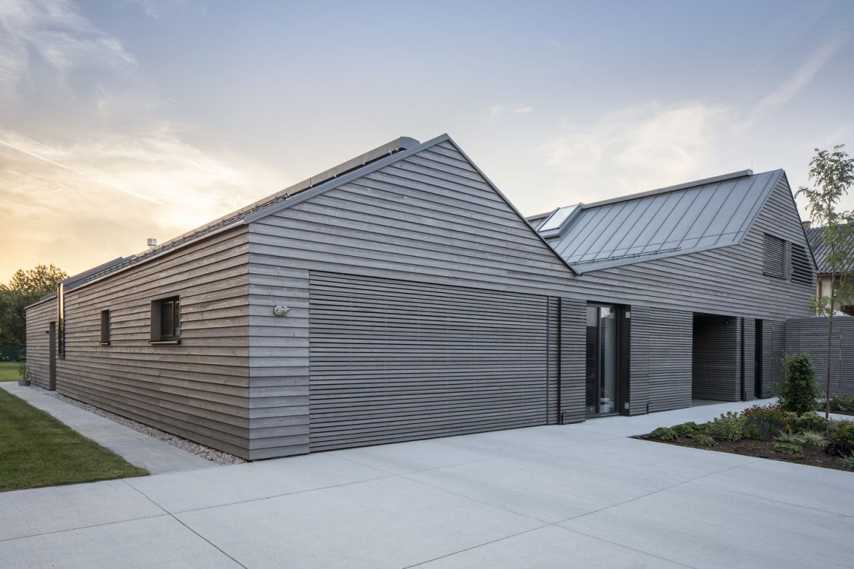 Esta casa es bastante grande en comparación con todas las demás que les mostramos hasta ahora. Fue diseñado por el estudio HEIMSPIEL architektur y está ubicado en Burgenland. Tiene una planta en forma de U que forma tres volúmenes separados, todos conectados bajo este techo plegado asimétrico que se ve muy bien desde el exterior. Esta es en realidad una interpretación moderna del clásico techo a dos aguas, que era un requisito impuesto por las normas locales. Cada una de las tres alas tiene una altura diferente y una estructura y geometría distintas. Todos se conectan entre sí de una manera muy armoniosa.