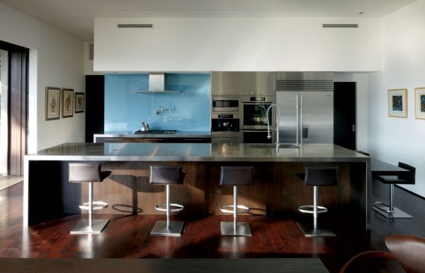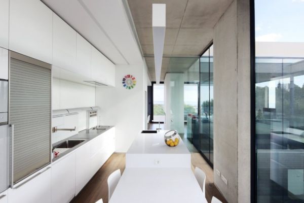 El interior de la casa es moderno. Tiene una planta diáfana y, en el lateral, la fachada de cristal elimina casi por completo la barrera entre interior y exterior. Los principales espacios de vida son muy aireados y espaciosos. Los numerosos espacios de almacenamiento incorporados mantienen todo fuera del camino, lo que permite que las habitaciones estén ordenadas. El mobiliario también es minimalista y los materiales utilizados para el interior incluyen piedra arenisca para los suelos, yeso blanco para las paredes, roble para los muebles y vidrio y aluminio para las ventanas.