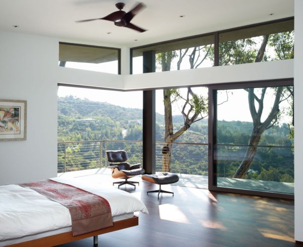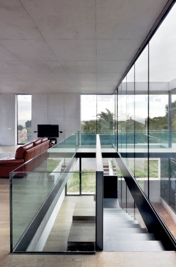 Pero las hermosas vistas también se pueden disfrutar y admirar desde el interior gracias a la fachada de cristal. Los grandes porches brindan protección contra la luz del sol y el calor del verano sin obstruir las vistas. El nivel superior también cuenta con una especie de patio abierto que divide el dormitorio principal y los dormitorios de los niños. Sirve como una plataforma abierta y contribuye al diseño único general de la casa.