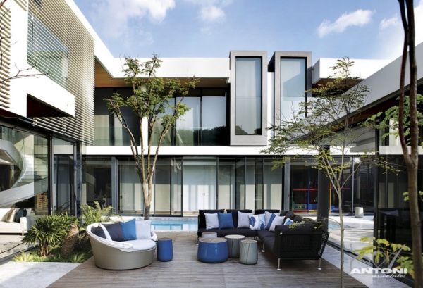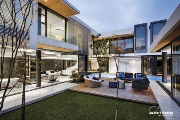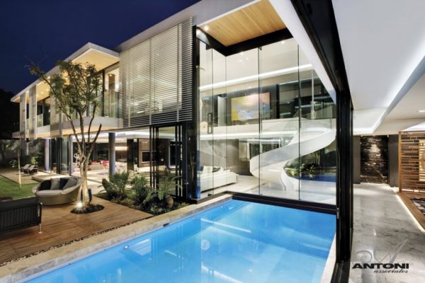 Ubicada en Johannesburgo, Sudáfrica, esta sorprendente residencia contemporánea fue diseñada por SAOTA – Stefan Antoni Olmesdahl Truen Architects y ANTONI ASSOCIATES. Se le pidió al equipo que ideara un diseño para una casa contemporánea para una familia extensa. El sitio elegido tenía una suave pendiente y estaba rodeado de árboles. La privacidad que ya brindaba el sitio permitió a los arquitectos idear un diseño que abre casi por completo la casa hacia el exterior.