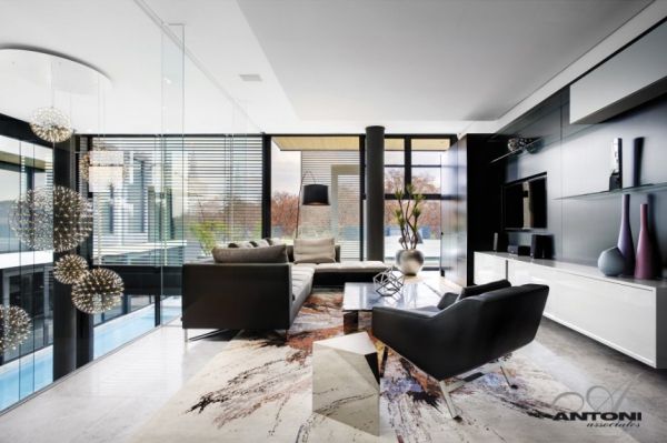 La casa se separó en dos zonas que comparten una entrada común y un camino de entrada. Son básicamente dos casas con diseños en forma de U que se organizan alrededor del patio. Pero, aunque las dos casas están separadas entre sí, también comparten una serie de espacios comunes. Por ejemplo, la escalera de caracol de cinta conecta los dos volúmenes en el centro. Los principales espacios habitables junto con la cocina se encuentran al norte. La sala de juegos, el gimnasio y la piscina están situados en el lado oeste.