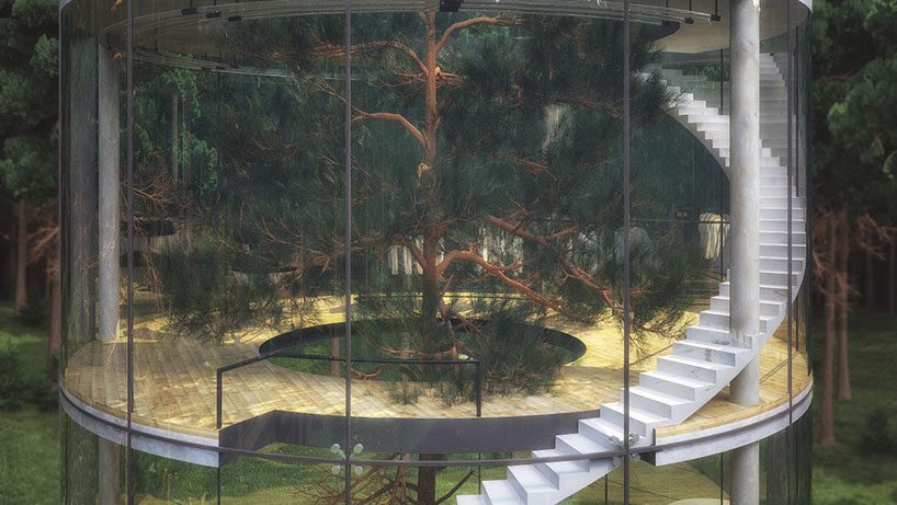 Una cosa es tener un árbol en la terraza o incluso dentro de la casa y algo completamente diferente es construir toda la casa alrededor de un árbol enorme. El proyecto de A.Masov design Studio es muy interesante en este sentido. En cierto modo, podrías llamar a esto una casa del árbol inversa. Fue concebido como un cilindro de vidrio transparente que envuelve un gran árbol.
