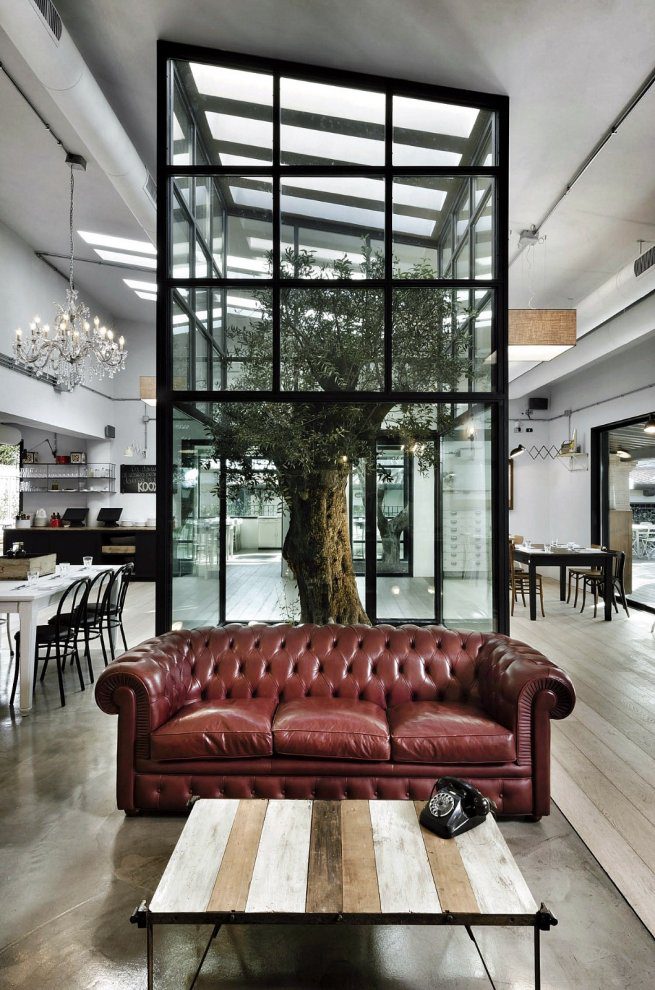 Las residencias privadas no son las únicas que se preocupan por la naturaleza y quieren salvar los árboles. El restaurante Kook está diseñado con un principio similar en mente. El interior fue un proyecto de Noses Architects en 2012. Con mucho, la característica de diseño más llamativa e interesante es un árbol rodeado de paredes de vidrio.