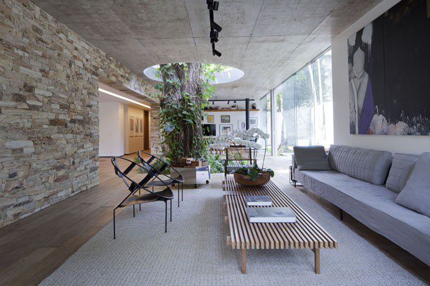 Este es el patio central de la casa y todos los espacios interiores tienen acceso o vista a este espacio. Un techo abierto permite que la luz del sol ingrese al patio asegurando un ambiente saludable para el árbol. Además, ese no es el único árbol que se conservó al construir la casa. Varios otros fueron acomodados en cubiertas y terrazas.