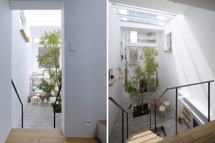 Como resultado, los espacios interiores están ocultos pero, sin embargo, el área interior está llena de luz natural y plantas. Varios pequeños árboles y plantas crecen libremente por toda la casa, mientras que una claraboya en el centro les ofrece luz y abre la decoración. La planta baja es la más verde de todas, con jardines y macizos de flores elevados que convierten toda la zona en un patio.