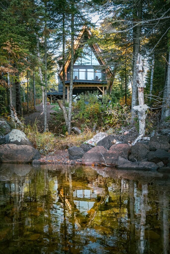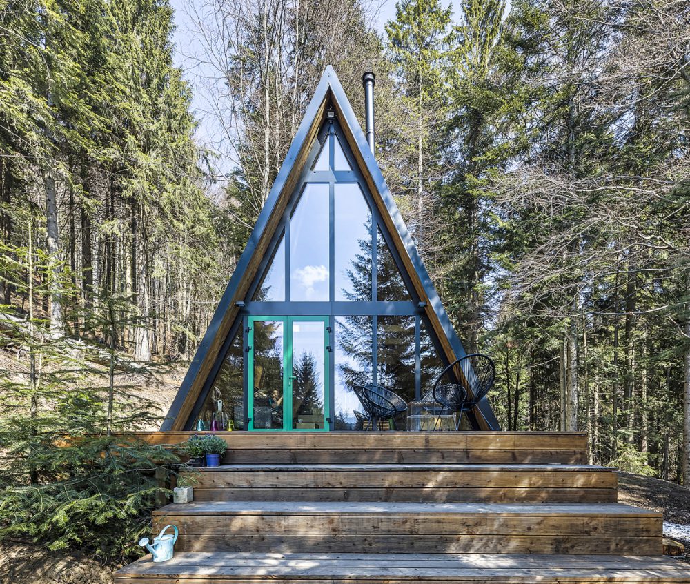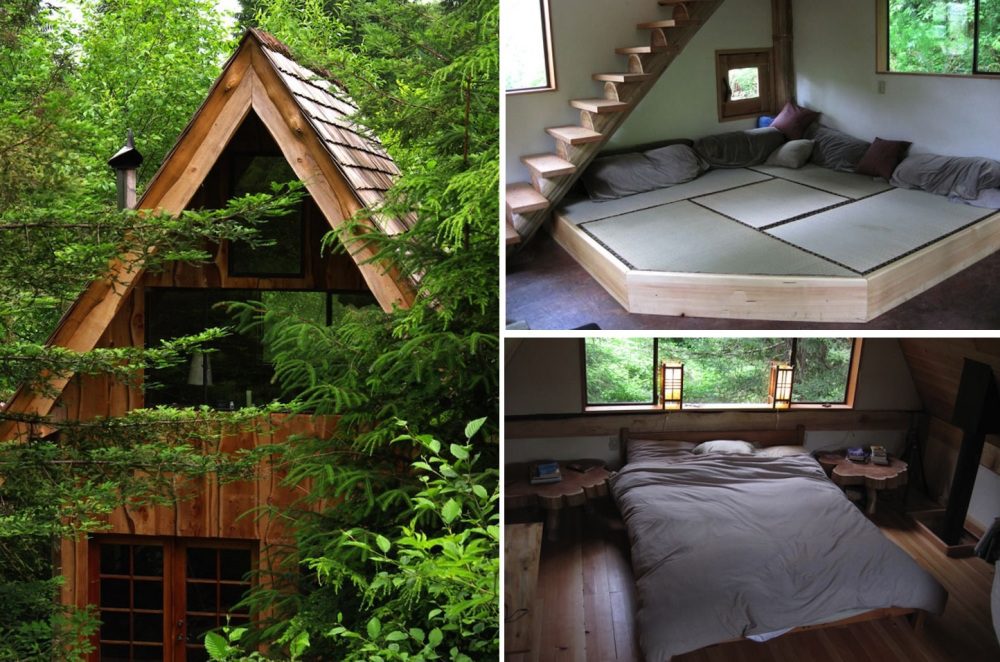 Una estructura de marco en A funciona bien en forma pequeña. Pueden ofrecer todas las comodidades básicas y seguir teniendo un diseño sostenible. Por ejemplo, los constructores utilizaron materiales de origen local y elementos reciclados para construir esta cabaña de madera. Además, observe todos los elementos ingeniosos, como los muebles de forma orgánica o los detalles de acento reutilizados.