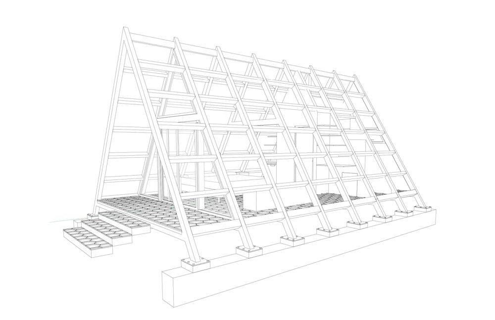 Todos los planes de estructura en A son similares en el sentido de que tienen una línea de techo de pico alto. Debajo del techo, hay una serie de vigas y cerchas que se unen en la cima y descienden al suelo sin un muro intermedio.