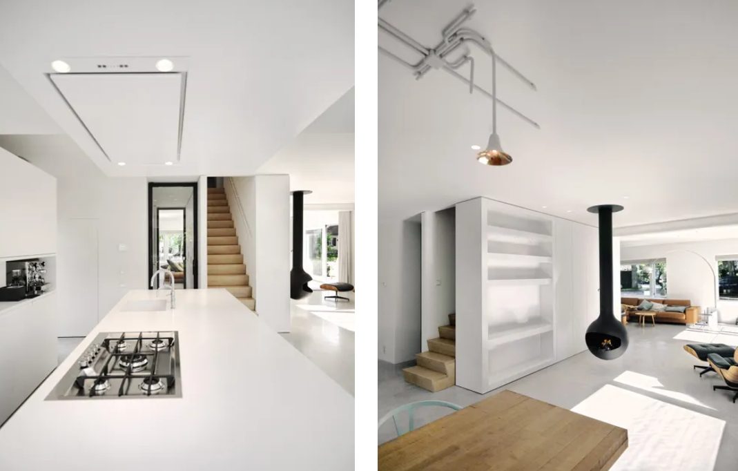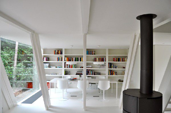 dmvA construyó esta casa con estructura en A. Se encuentra cerca de Brecht en Alemania. Tomaron la casa de campo con estructura en A y construyeron una extensión moderna para la casa principal. Los arquitectos construyeron la ampliación con materiales modernos. Esta sección presenta una pared con una ventana grande. Combinado con el interior totalmente blanco, esto proporciona abundante luz natural para las habitaciones interiores.