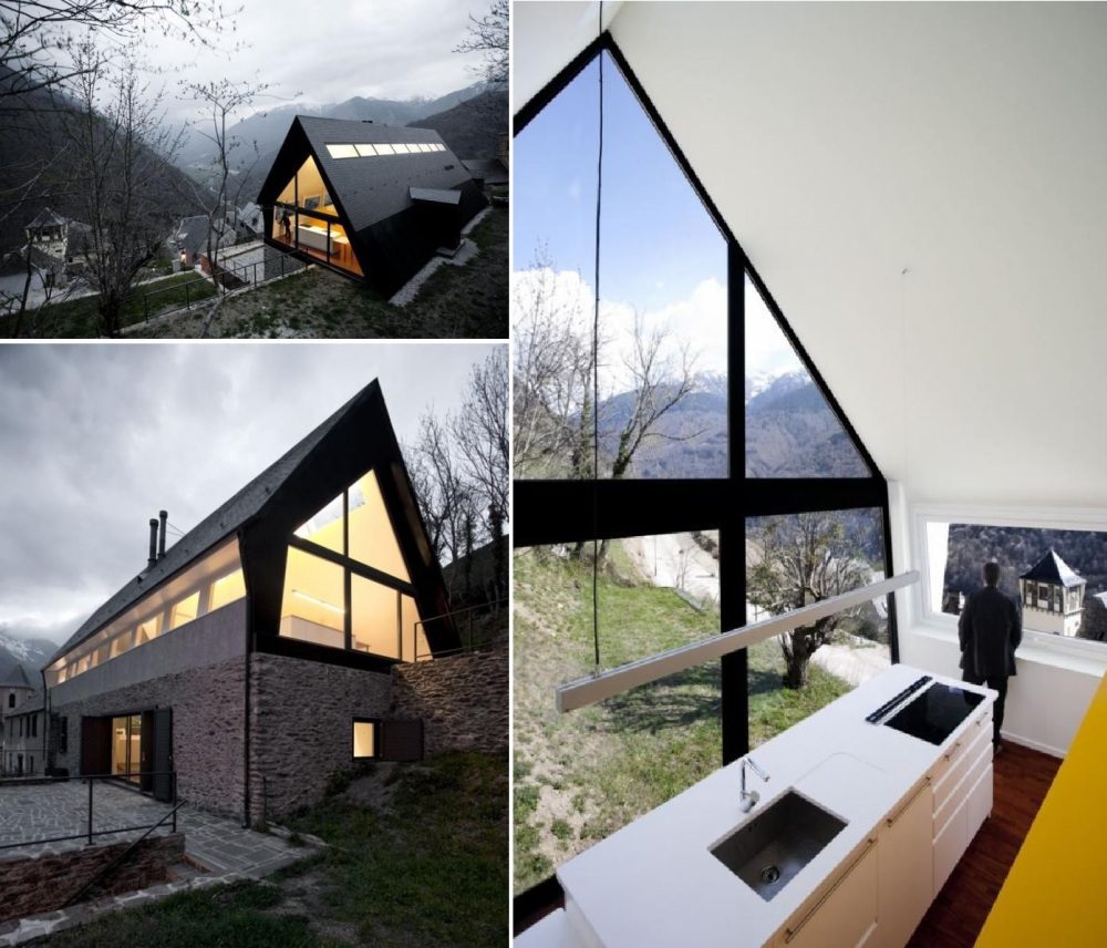 Los propietarios pueden modernizar y personalizar un estilo A-Frame clásico para adaptarlo a sus necesidades y al paisaje. Aquí hay un ejemplo de una hermosa casa en los Pirineos españoles. Los propietarios modificaron el diseño de la casa según la ubicación del edificio. Está en un sitio alto en la montaña que ofrece magníficas vistas. La parte superior de la casa es una forma tradicional de marco en A. Sin embargo, el propietario construyó la sección inferior con muros rectos de piedra en la ladera de la colina. Esto agrega espacio adicional a la casa.