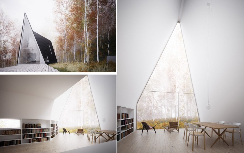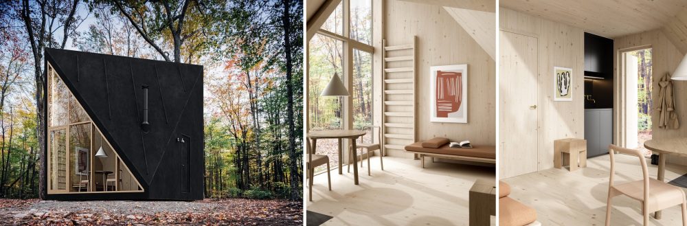 Esta pequeña cabina con estructura en A de la compañía Klein tiene lo mejor que el diseño escandinavo tiene para ofrecer. El exterior tiene elegante asfalto negro en las paredes y el techo. El interior de la cabaña tiene piso de abeto Douglas, techo de corcho y ventanas y puertas de roble.