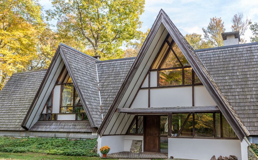 Este marco en A de mediados de siglo se construyó en la década de 1940 y se amplió en la década de 1970 . Esta casa es distintiva en su diseño. Hay seis secciones de conexión, cada una con una estructura de marco en A. El estilo interior y exterior rinden homenaje al carácter rústico de la casa sin exagerar. Así, en su conjunto, el efecto de la casa es natural y elegante.