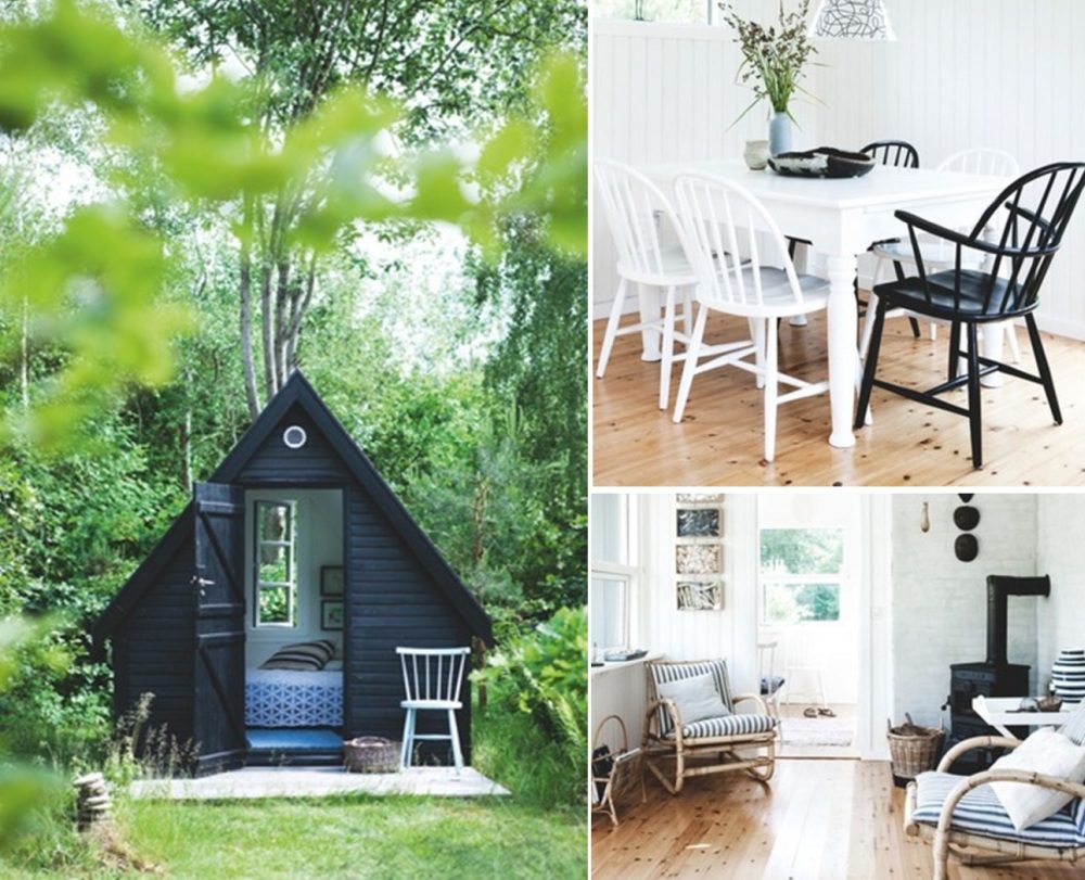 Esta cabaña estilo A-frame no es exactamente un A-frame porque tiene paredes laterales bajas; sin embargo, la empinada línea del techo le da la misma forma. Los propietarios han pintado el exterior de negro, pero el interior está lleno de luz con pisos de madera natural teñidos y paredes pintadas de blanco.