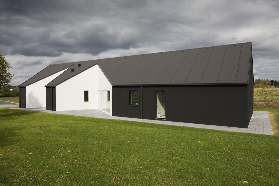 Sinus House recibe su nombre porque los dos espacios parecen cortados de la casa. La casa de campo danesa es más dramática con su fachada negra. Si bien podría haberse pintado con cualquier color neutro, las secciones blancas «cortadas» resaltan el negro moderno de los filetes en el techo y las paredes de ladrillo gris antracita.