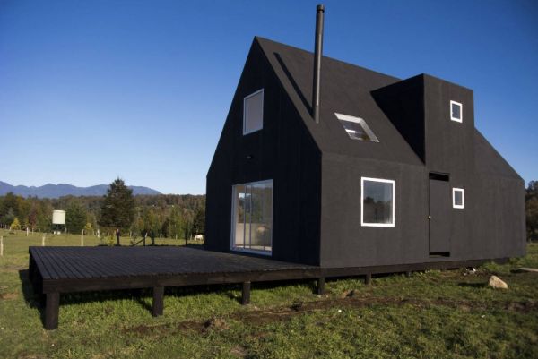 La casa está en Calafquén, Comuna de Panguipulli. Es importante destacar que una membrana de asfalto cubre completamente el exterior, lo que ayuda a retener el calor. El techo inclinado le da un elemento tradicional dentro del enfoque contemporáneo general . Finalmente, el marco blanco agrega un acento al negro y ayuda a que las ventanas se destaquen.