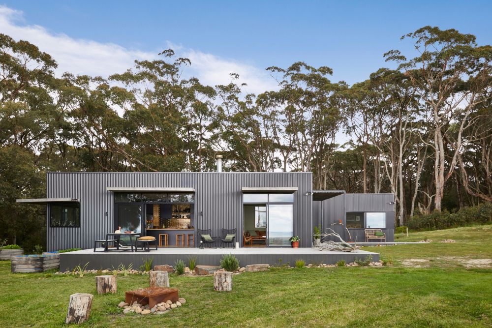 Un exterior gris oscuro y negro es el acabado perfecto para esta casa única. De hecho, también es un modelo de sustentabilidad en Fish Creek. Australia. El exterior de la casa, diseñado por Archiblox , utiliza un revestimiento corrugado Woodland Grey Colorbond.