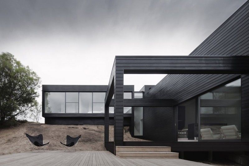 Esta casa moderna negra es una nueva versión de la tendencia de las casas de campo. En lugar de optar por el blanco típico, esta casa modular opta por un drama oscuro.