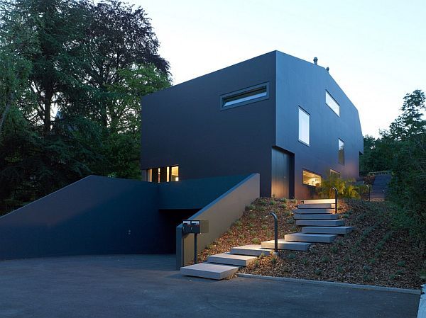 Angela Waibel de Hajnoczky.Zanchetta Architekten creó el concepto de esta casa de dos familias alta y delgada en una arboleda cerca de Zúrich. Al igual que con otras casas modernas del bosque , el exterior negro ayuda a que se desvanezca contra el fondo de los árboles, las hojas y la topografía. Por el contrario, en el invierno nevado, la casa se destaca como una joya oscura. La forma triangular de la casa la convierte en un diseño distintivo. Además, el exterior negro solo sirve para resaltar su silueta inusual.