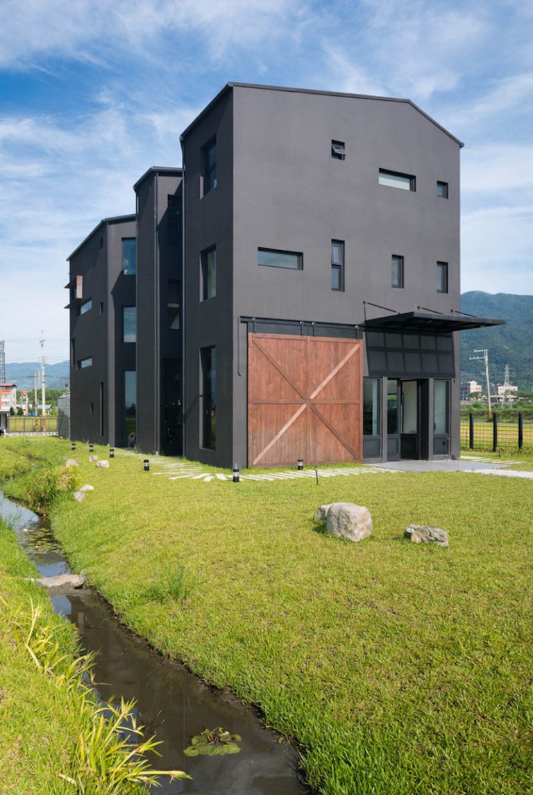 Como un granero negro tirado en el paisaje taiwanés, esta casa negra de los arquitectos C3 y el diseñador de interiores Po-Lin Chen es en realidad una villa para invitados. Parte cafetería y parte hotel, el edificio cuenta con un impresionante exterior negro mate. La disposición de las pequeñas ventanas es más como un elemento gráfico. A diferencia de cualquier cosa cercana, es probable que se convierta en un punto de referencia debido a su exterior negro.