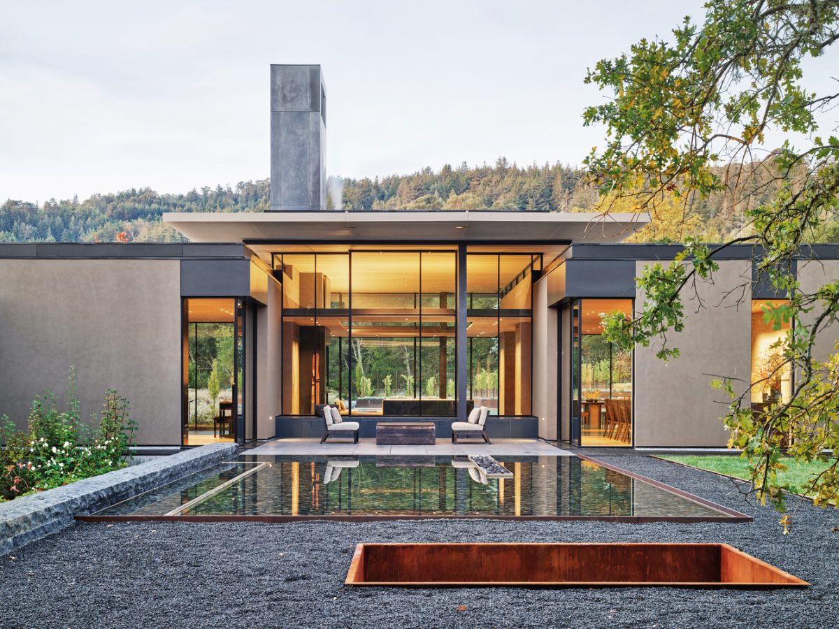 Completada en 2017, la mansión moderna fue diseñada por Olson Kundig . Una estructura central, tres edificios auxiliares y amplias áreas al aire libre completan el diseño. La estructura central es una base que ancla la propiedad y crea cohesión entre las diferentes áreas.