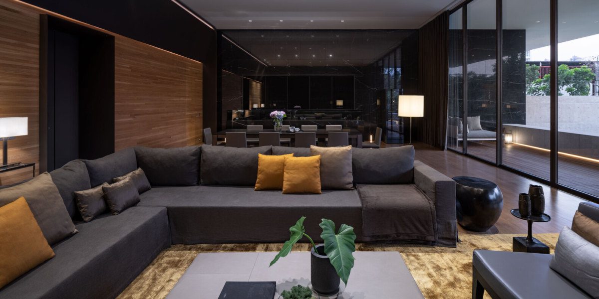 El exterior es una cáscara de hormigón y techos expuestos. La mansión moderna es cálida, acogedora y relajante. La madera y las texturas suaves ayudan a desarrollar su estilo.
