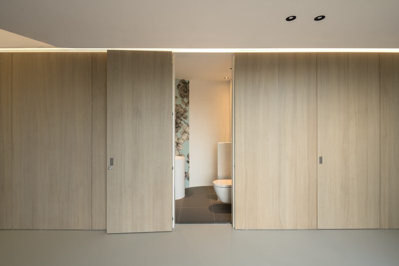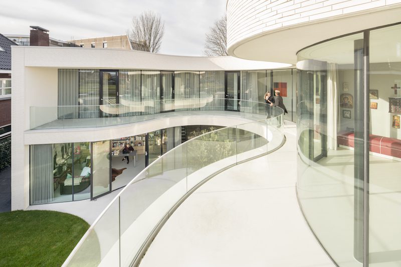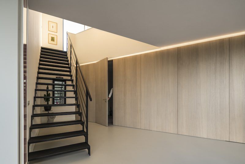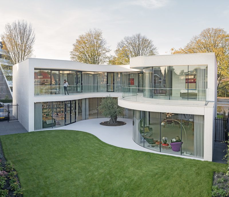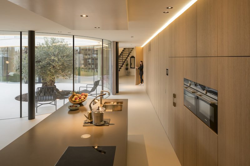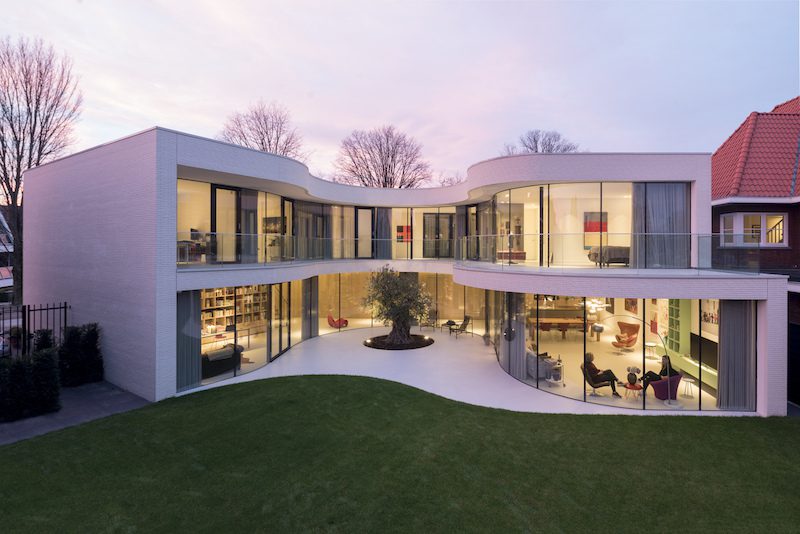 El cliente quería que la casa ofreciera un fuerte sentido de cerramiento y, al mismo tiempo, que recibiera mucha luz natural e incluyera espacios abiertos. Los arquitectos lograron este equilibrio perfecto dando a la casa dos fachadas muy diferentes. La fachada trasera da al jardín y está completamente abierta al exterior, con ventanas de altura completa, paredes curvas, un patio y el punto focal: un solo olivo en el centro de todo. En contraste con todo esto, la fachada a la calle no tiene ventanas y su estructura de ladrillo está definida por líneas rectas y ángulos.